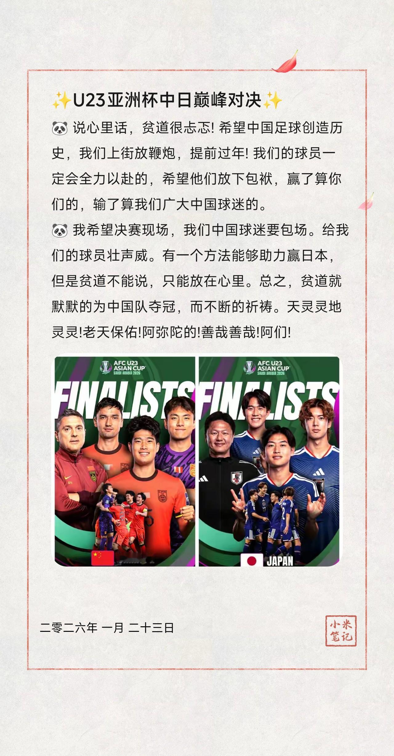 🐼 说心里话,贫道很忐忑! 希望中国足球创造历史,我们上街放鞭炮,提前过年! 我们的球员一定会全力以赴的,希望他们放下包袱,赢了算你们的,输了算我们广大中国球迷的。 🐼 我希望决赛现场,我们中国球迷要包场。给我们的球员壮声威。有一个方法能够助力赢日本,但是贫道不能说,只能放在心里。 🐼 这批球员的整体能力还是很不错的。就是缺乏能力特别突出的球员,也就有一个守门员李昊。但是,比他们小两岁的那批球员里可真有非常突出的球员。如谢晋、万项、赵松源、邝兆雷等。 ——总之,贫道就默默的为中国队夺冠,而不断的祈祷。天灵灵地灵灵!老天保佑!阿弥陀的!善哉善哉!阿们! 作者:龙须面🧐