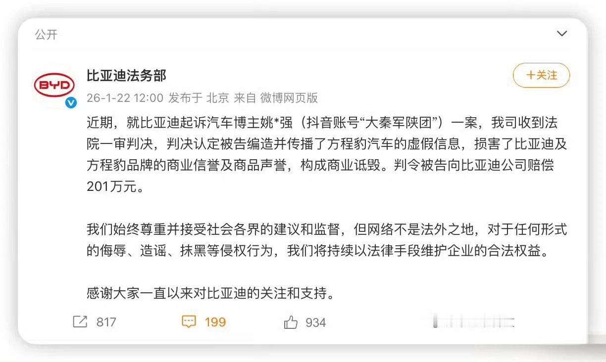 方程豹胜诉姚十八近日,比亚迪方程豹胜诉“姚十八”的消息震惊了整个车圈,判决支付比亚迪赔偿款201万元。说实话现在网络环境确实有点乱…有些人为了博眼球、蹭流量,什么数据都敢编,什么节奏都敢带。想知道谁家测试是以180km/h的时速进行,这都严重超速了,在忽视法律法规情况下得出的结论根本没有可看性。咱国产汽车品牌走向世界,靠的是技术的硬实力,了不起的背后是无数个不容易的瞬间。如果测评失去了客观,数据沦为流量的玩物,受损的就不只是品牌,更是侵害了每一个消费者的知情权。
