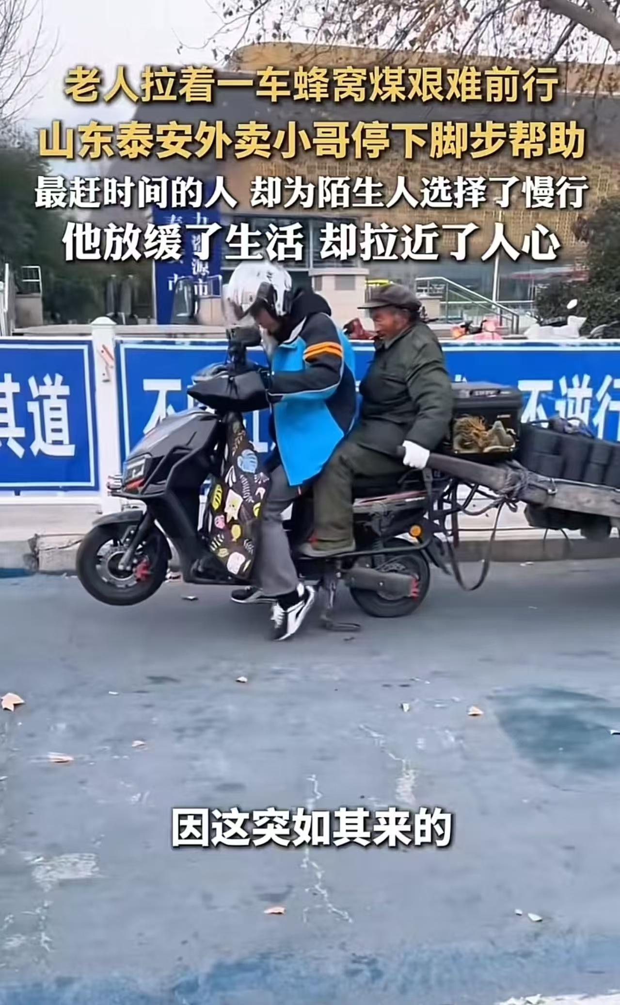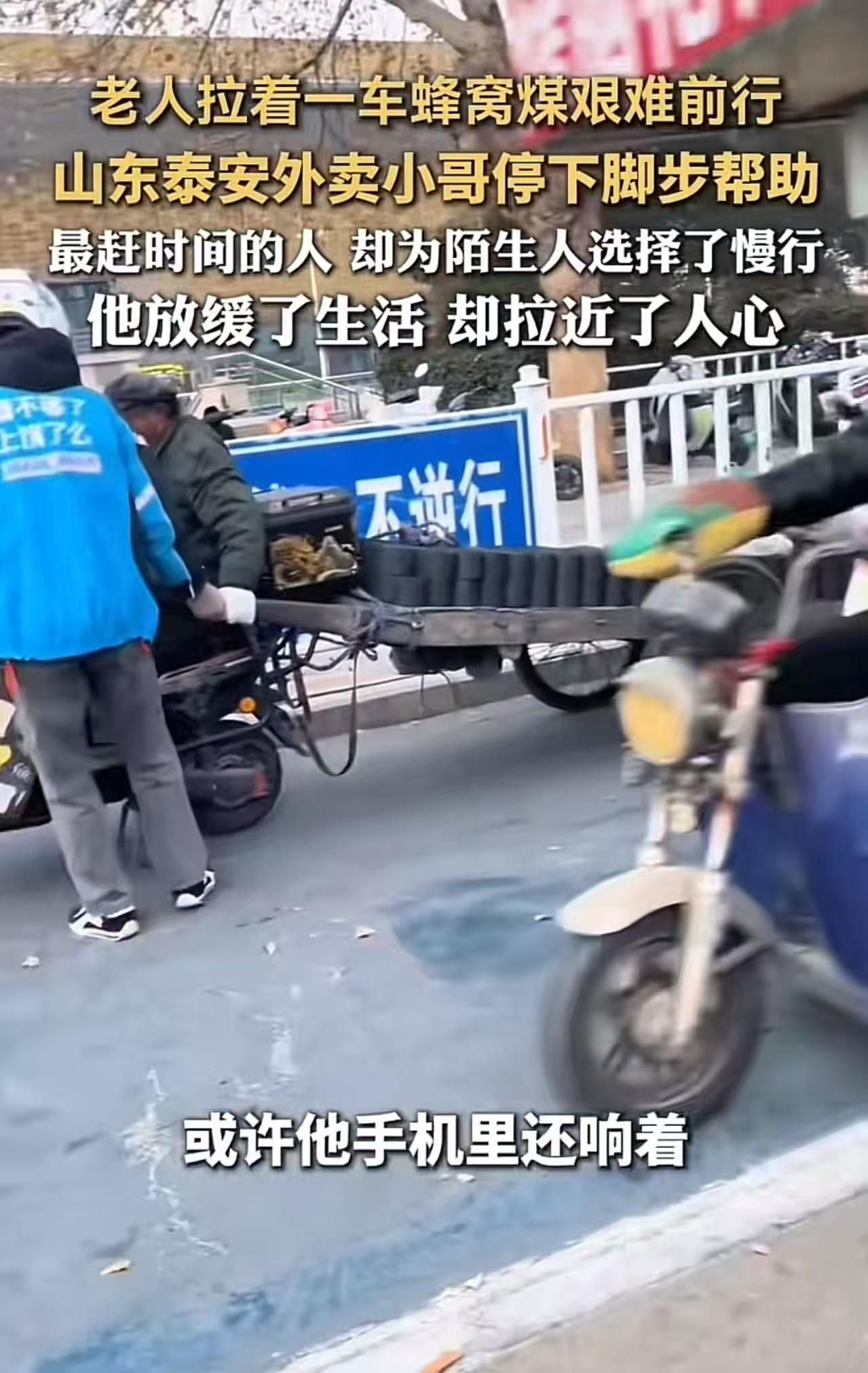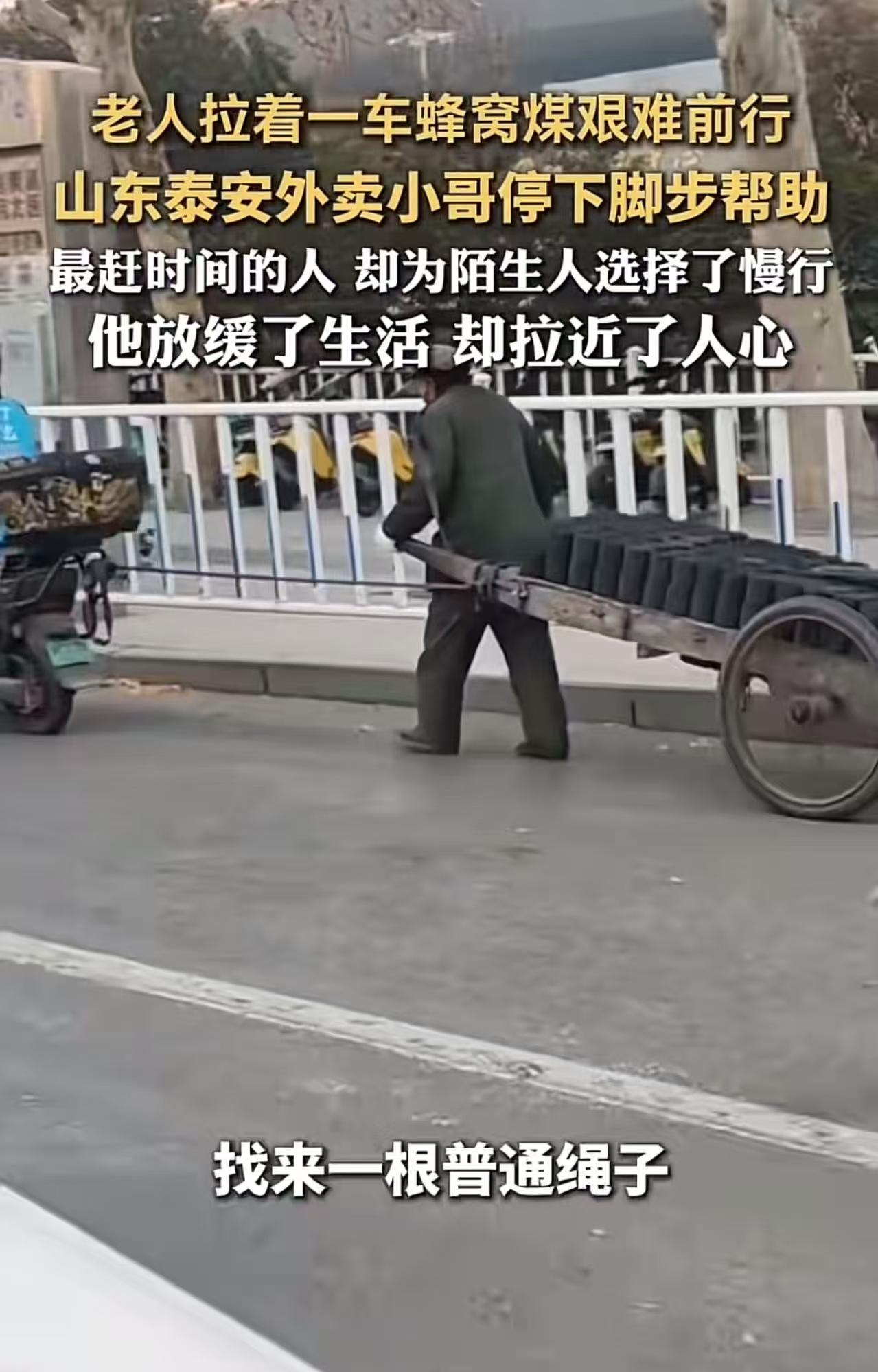 山东泰安,老人拉着一车蜂窝煤艰难前行,路上的人都选择无视,一个外卖小哥却选择停车帮助!网友:最赶时间的人,却为陌生人选择了慢行,他放缓了生活,却拉近了人心! 近日,山东泰安遭遇强冷空气突袭,气温骤降至零下6℃。寒风如刀,刮在脸上生疼,街上的行人裹紧羽绒服,低头疾走,生怕多停一秒。 就在这条车水马龙的主干道上,一位老人,穿着洗得发白的单薄棉袄,佝偻着背,双手死死攥住一辆破旧手推车的把手,正艰难地向前挪动。 车上堆满了黑黢黢的蜂窝煤,足有上百斤重,老人每前进一步,都伴随着粗重的喘息和颤抖的双腿。 他要去两公里外的市场卖煤——那是他一天唯一的收入来源。 可年纪大了,腿脚不利索,老人拉的很吃力! 路过的行人不少,但没人停下,没人回头,仿佛老人和他那辆沉重的煤车,只是城市背景里一道“理所当然”的风景。 就在老人咬牙坚持、额头沁出冷汗时,外卖员小李(化名)缓缓靠边停下。 他快步走到老人身边,说:“大爷,我帮您拉一段吧!” 不等老人推辞,小李从车座下掏出一根绳子,将一端系在自己的电动车后架,另一端牢牢绑在煤车把手上。 接着,他又扶老人坐上电动车后座,让老人扶着车把,在寒风中缓缓前行。 有人悄悄拍下视频,有人眼眶泛红,更多人开始反思:为什么最赶时间的人,反而最有心? 视频传开后,网友泪目刷屏: “他送的是外卖,捎带的是人间温情。” “别人都在‘赶生活’,只有他在‘过日子’——有温度的日子。” “系统给他30分钟送餐,他却用10分钟温暖了一个老人的余生。” “这根绳子拴住的不是煤车,是快要被冷漠冻僵的社会良心。” 【评语】 真正的善良,从不需要“有空”,只需要“愿意”。 小李本可以视而不见——毕竟,他迟到一单,可能被扣钱、被差评、被系统降权;但他选择了停下,哪怕这意味着今晚少赚50块,明天更累一分。 老人拉的不是一车煤,而是一个被遗忘在时代角落的普通人最后的尊严;小李慢下来的不是车速,而是这个狂奔社会里,早已丢失的共情能力! 两个为生活奔波的普通人,因着突如其来的善意紧紧相连,没有惊天动地的壮举。这世间最美的温情,莫过于看见别人的不易,而我愿意与你分担同行!