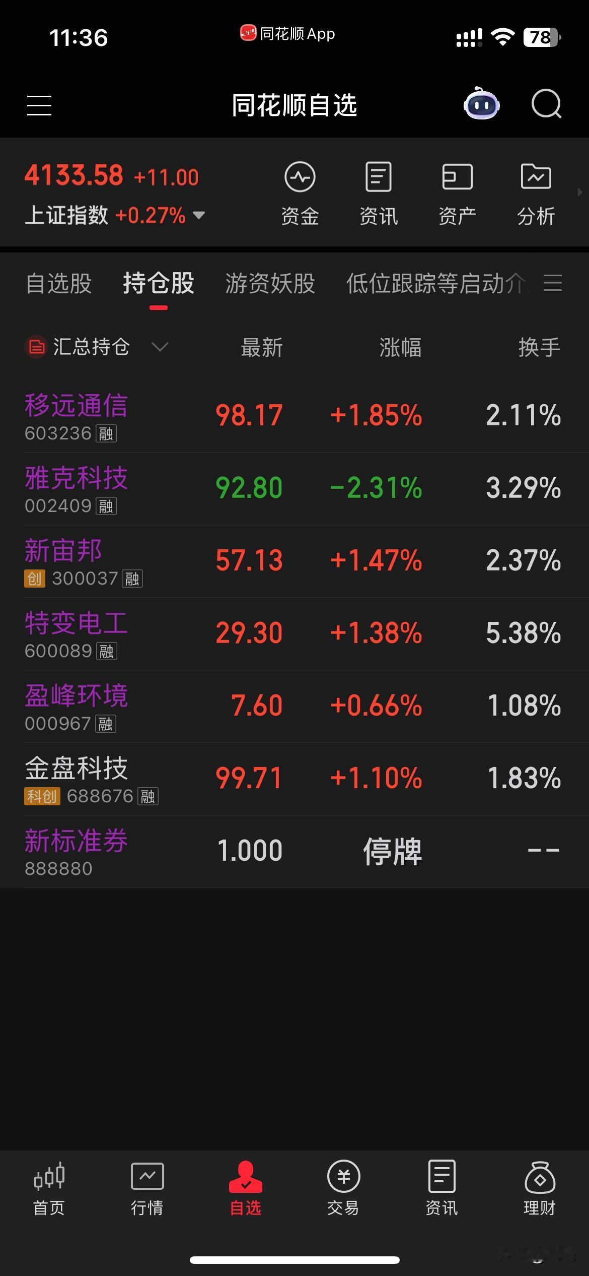 今天上午开盘后大盘情绪可以,不料盘中两次遭遇打压,情绪有所回落,不过支撑还是不错。电网板块开盘后一路走高,半小时后回落,随后反弹到前期高点再次回落。我的金盘和特变也是跟板块一样的走势。今天新宙邦受转债强赎取消影响开始企稳走好。雅克受芯片板块走弱影响也是一路下跌。今天虽然持有的股票除了雅克外都是红盘但到收盘时涨幅都不大。盈峰上午冲高回落,收一带长上影线K线,有点压力了,不过我只剩1百股,期待回落让我上车[捂脸],上午也就是收复昨日失地而已,红1千1。