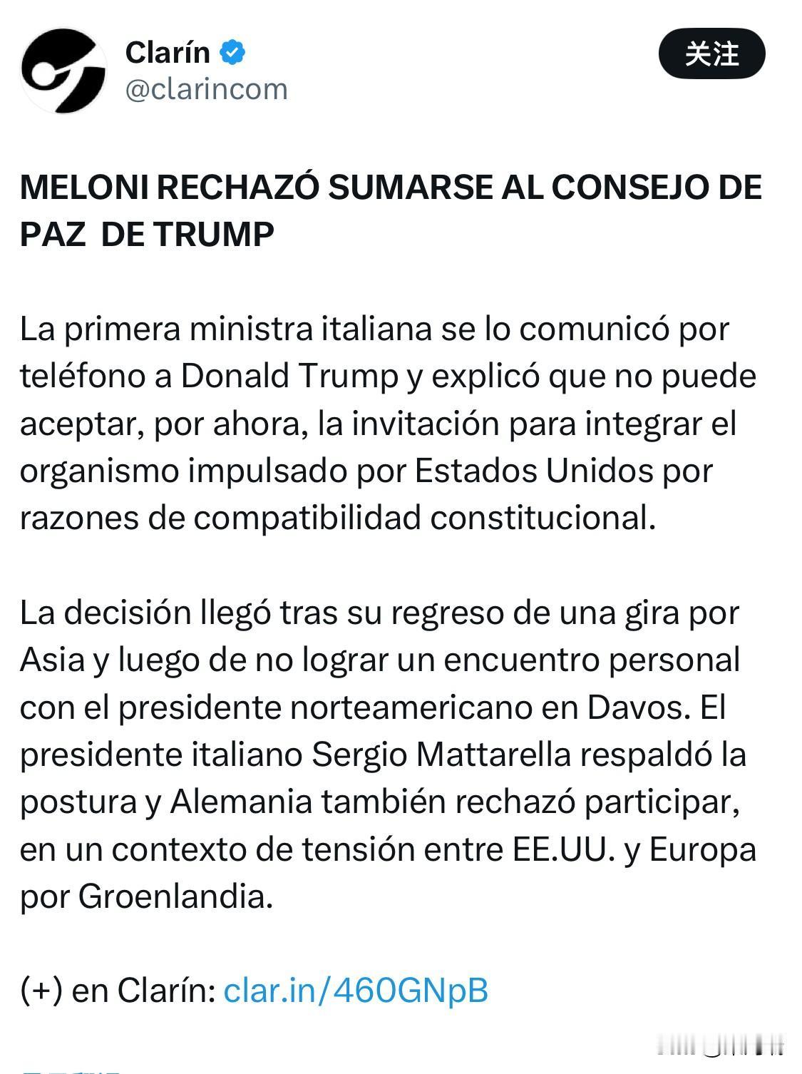 意大利总理梅洛尼拒绝加入特朗普的和平委员会 意大利总理通过电话告知唐纳德·特朗普,并解释说,由于宪法兼容性问题,她目前无法接受加入美国推动的组织的邀请。 这一决定是在他结束亚洲之行返回后做出的,此前他未能争取到在达沃斯与美国总统的会面。意大利总统塞尔焦·马塔雷拉支持这一立场,而德国也因美国和欧洲在格陵兰问题上的紧张关系而拒绝参加。