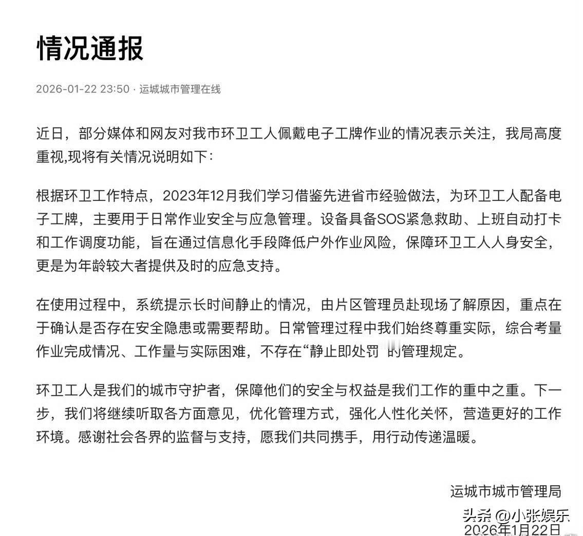山西运城给环卫工人发了带定位的工牌,官方说这不是为了盯着他们干活,主要是方便紧急情况求助、自动打卡和调度工作。比如老人突发状况能快速求助,管理员也能及时知道他们是否需要帮忙。 网上说“站着不动就罚钱”是假的,系统提示长时间不动时,管理员会去看看情况,不是直接处罚,管理时会考虑实际工作情况和困难。而且不光环卫工人戴,管理人员、司机和车辆也都用这个,说是为了安全和管理方便,不是单纯监督。 你怎么看待这件事?