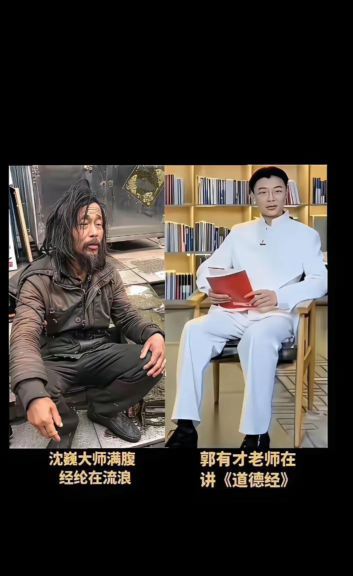 看下图 这幅图呈现了极具反差感的现代文化现象:左侧是上海“流浪大师”沈巍——饱读诗书却衣衫褴褛、流落街头;右侧是网红“郭有才”——在简陋直播环境里讲授《道德经》。两者并置,构成一种对“知识传播”与“生存状态”的尖锐对比。 学问与生存割裂,盲流与网红的碰撞,体面与学识,行式与内涵的反差,给人留下耐人寻味的思考! 这幅拼贴像一面棱镜,折射出知识在当代社会的多重困境与嬗变:当经典走入流量场,当学问脱离庇护,知识的价值与传播的真相,才是重中之重的,急需解决的问题!