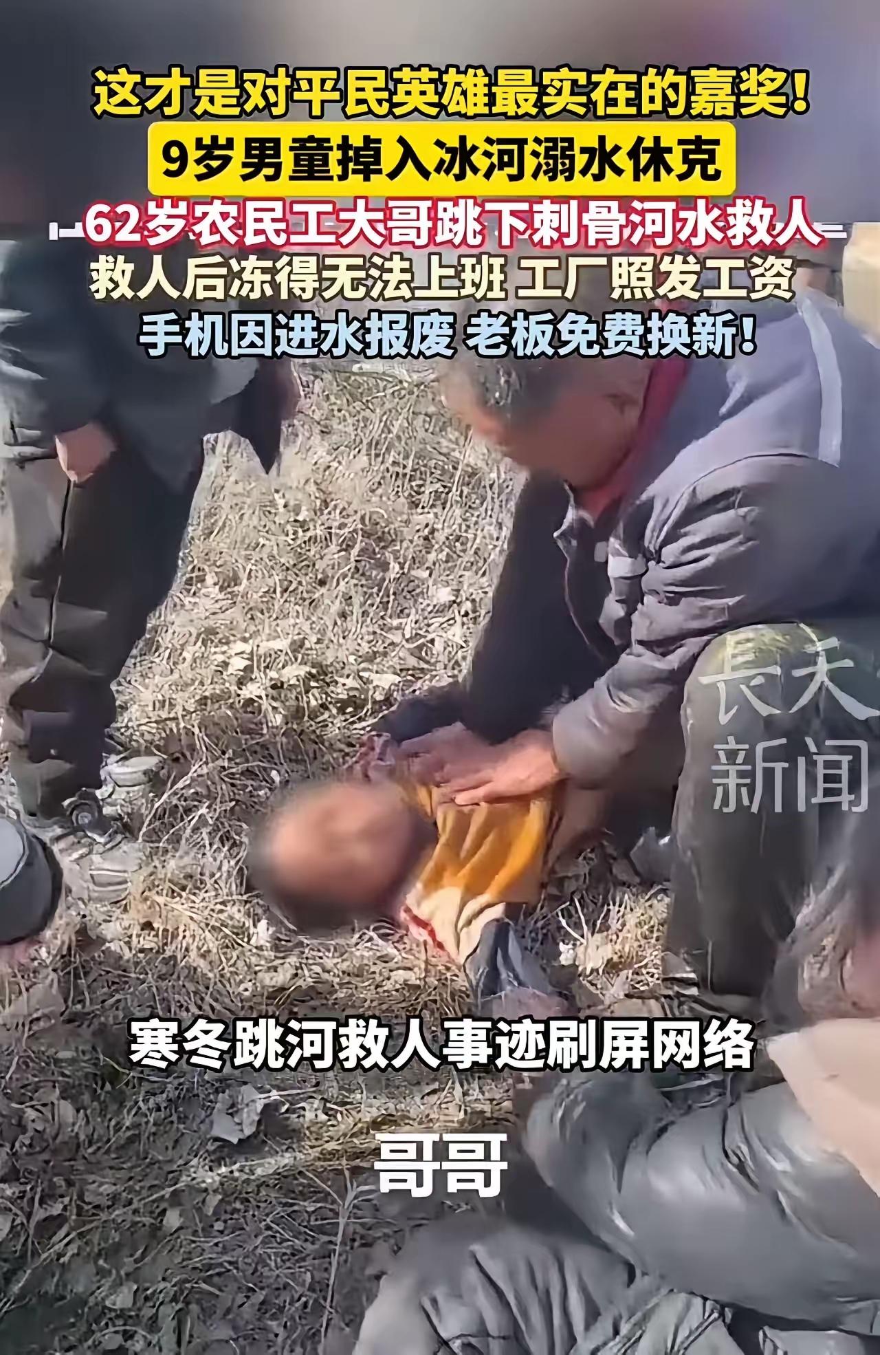 62岁农民工跳冰河救人,冻到没法上班,老板的操作绝了! 3℃的天,河水凉得像冰窖,9岁娃玩着玩着掉河里,扑腾几下就没影了!62岁的龙相臣听见呼救,外套都没扒,“扑通”一声就扎进去,跟寒气硬刚5分钟,在淤泥里摸出孩子。 娃救上来没气了,老龙急得直冒汗,照着电视里的样子跪地上按压,硬是把娃从鬼门关拽了回来!可他和工友代艳合冻得嘴唇发紫,瘫在地上直哆嗦,还琢磨着“耽误干活,工资得扣不少”。 谁知道老板一来,直接拍大腿:“工资一分不少!安心歇着!”见老龙手机泡水里报废,当场甩来一部新的,这波操作简直帅到骨子里! 咱就说,平民英雄拼着老命救人,良心老板兜底撑腰,这才是双向奔赴的正能量啊!没有虚头巴脑的表彰,全是实打实的尊重,比啥都管用。 这事儿也告诉咱,善良从不会吃亏,总有人会为你的勇敢买单。这样的老板、这样的英雄,不值得咱点个赞吗?