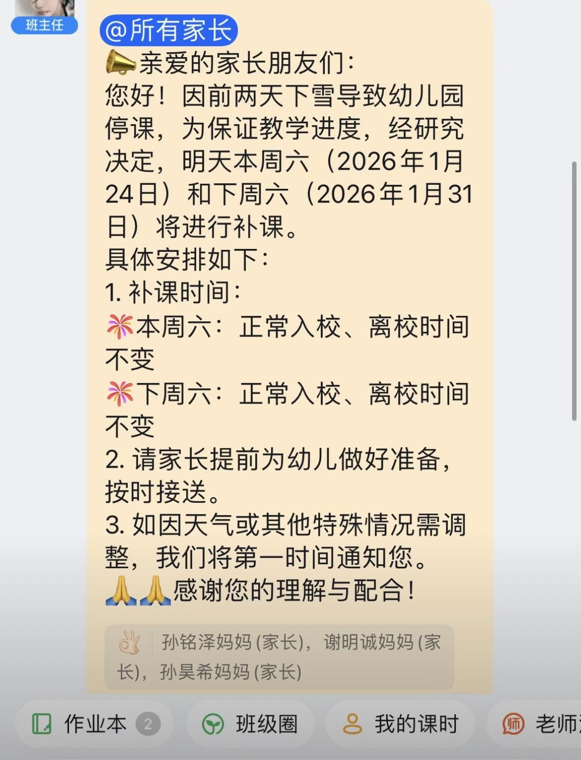 家长反映本周六幼儿园补课,老师在家长群发通知前两天下雪导致幼儿院停课,为保证教学进度本周六和下周六将进行补课。 不止幼儿园周六补课,其他部分中小学家长也有分享学校通知周末补课的情况,放假两天耽误的课程用两个周六再补过来。 中小学补课可以理解,幼儿园以看护孩子为主教学为辅,周末补课大概率是为了防止一些家长期末找学校就下大雪两天没上课退费用。幼儿园本周六补课
