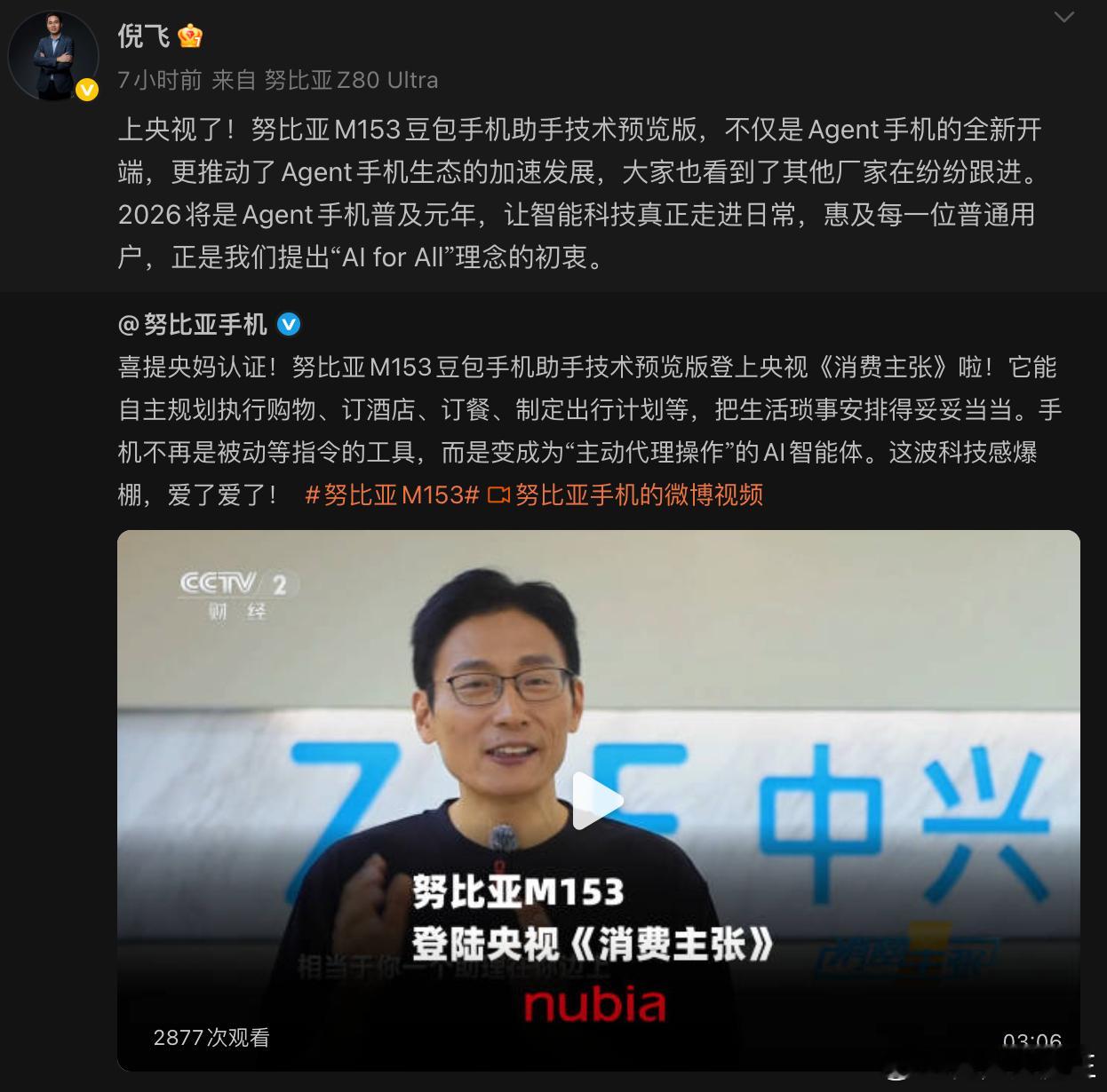 倪飞称2026将是Agent手机元年 Agent手机,真要来了。2026年AI注定是会有超级大的突破,AI for All 我们一起期待~!