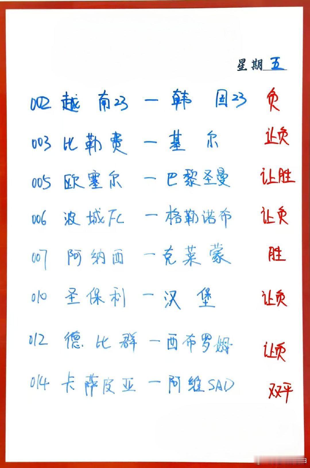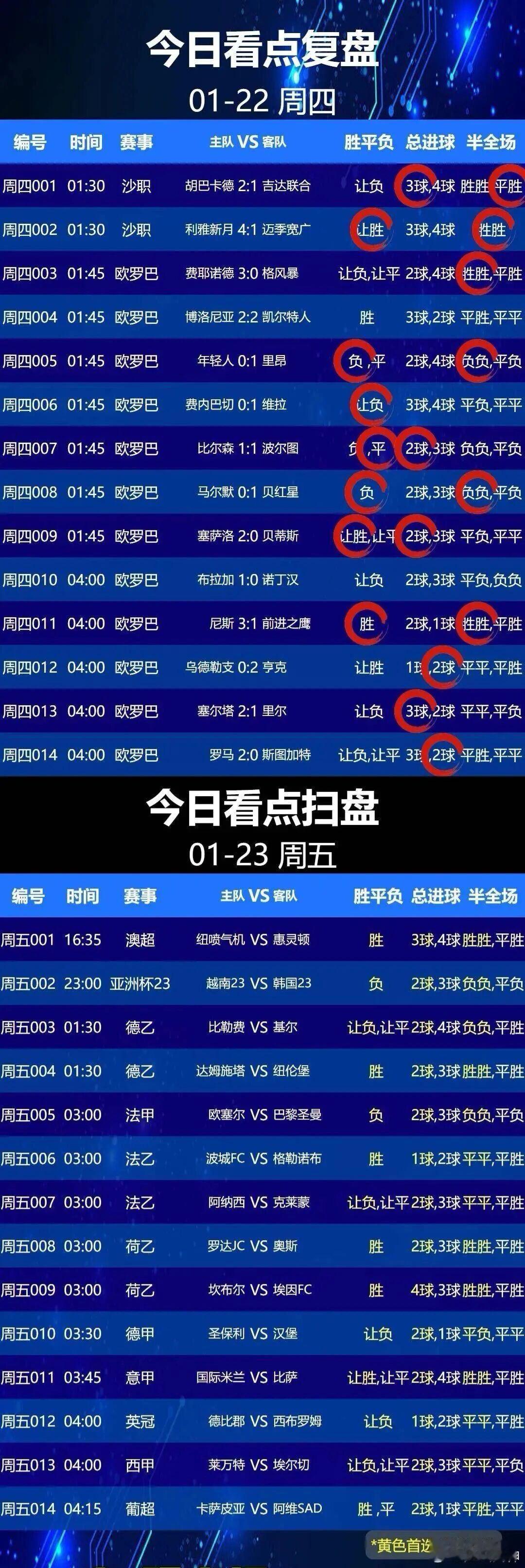 1月23日001 纽卡斯尔喷气机VS 惠灵顿凤凰002 越南U23 VS 韩国U23 003 比勒费尔德 VS 基尔004 达姆施塔特 VS 纽伦堡005 欧塞尔 VS 巴黎圣日耳曼006 波城 VS 格勒诺布尔007 阿讷西 VS 克莱蒙特