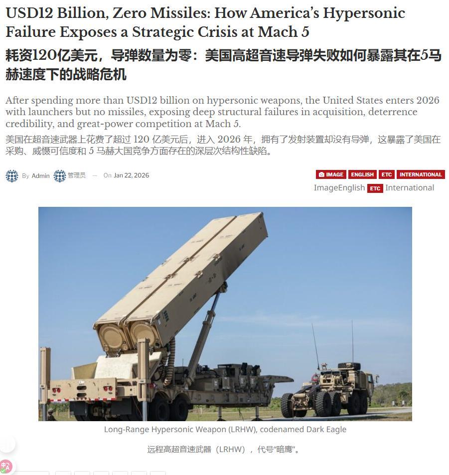 如果不念灭亡,就不要开战!多家美国媒体呼吁中国:一旦中美冲突,中国死路一条。想象一下,2025年中美之间擦枪走火,美国空军高层早就放话,中国会输得很惨。多家美国媒体齐声附和,警告北京别轻举妄动,否则国家灭亡在即。 说白了,现在的美国正陷入一种口号震天响、口袋却空空如也的尴尬境地。就在2026年1月22日,一份关于美军高超音速武器的调查报告撕掉了美军最后的遮羞布。美国在暗鹰导弹项目上砸进了120亿美元,结果到今天为止,美军手里竟然连一枚真正能打出去的成品导弹都没有。 这就好比一个在街头叫嚣要单挑的混混,嗓门比谁都大,狠话比谁都多,结果真要动手时,才发现自己腰里的枪竟然是个没装子弹的空壳。美国媒体越是疯狂叫嚣中国会输得很惨,就越说明他们在常规威慑手段失效后,只能依靠这种廉价的舆论恐吓来维持那摇摇欲坠的霸权幻象。 问题在于,现代战争的逻辑早已发生了质变。中国在近海构建的反介入区域拒止体系,已经让第一岛链变成了美军大型舰艇的禁区。美国军方心里很清楚,在中国的家门口打仗,他们不仅没有胜算,甚至连维持战争消耗的工业产能都早已萎缩。 实事求是讲,美国媒体这种灭亡论的调门越高,越证明他们对中国工业底气和军事潜力的恐惧。这种恐吓不仅吓不倒中国,反而让全世界看清了一个事实:那个曾经不可一世的霸权,如今只能靠吹哨子来给自己壮胆了。一个连高超音速导弹都造不出来的国家,不管媒体如何鼓噪,终究掩盖不了其纸老虎的本质。 以上是小编个人看法,如果您也认同,麻烦点赞支持!有更好的见解也欢迎在评论区留言,方便大家一同探讨。
