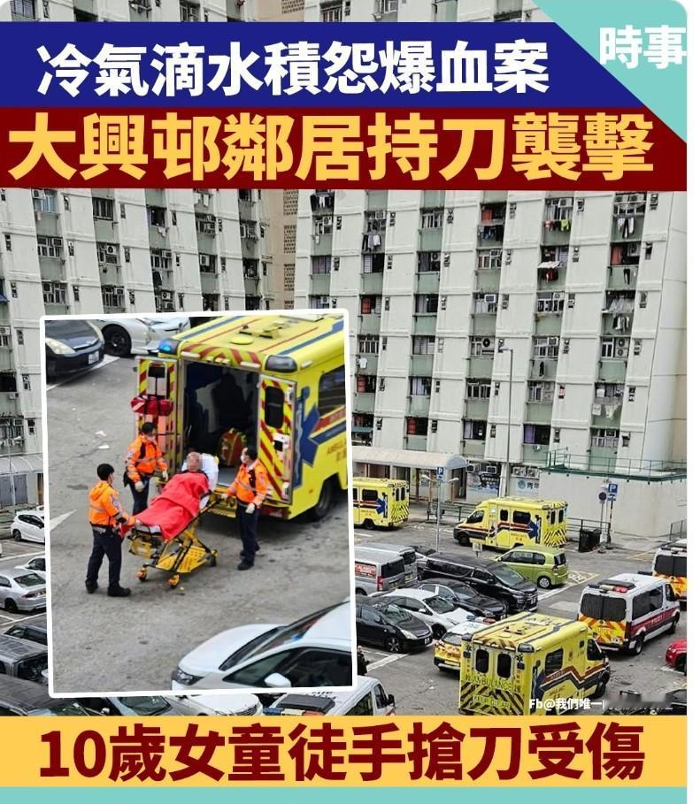 邻里关系处不好,后患无穷。 就因为夏天冷气滴水积怨,23号早上7点多,屯门大兴屯某小区楼上楼下两家人电梯里相遇后大动干戈。楼上一家三口受伤送医,楼下挥刀者被捕。 去年夏天,楼下住户就因为冷气滴水问题投诉楼上,看来是今年夏天也没解决,楼下憋气已久。 早上楼上男主和10岁闺女在电梯里与楼下男相遇,楼下男手拿利器袭击,小女孩表现出过人英勇,危急中夺刀救父。 孩子妈听见动静赶来后救人,被割伤左胳膊。女孩手擦伤,孩子爸手和腿也都是擦伤。 滴水声虽然小却很烦人,滴滴答答,对比较敏感的人来说就是噪音,甚至被认为是某种灾难。 其实这个问题也好解决,把排水管加长一些,或在落水点加一层毡布,都能改善。 鸡毛蒜皮的小事,解决不好就能成为恶性事件的“导火索”。