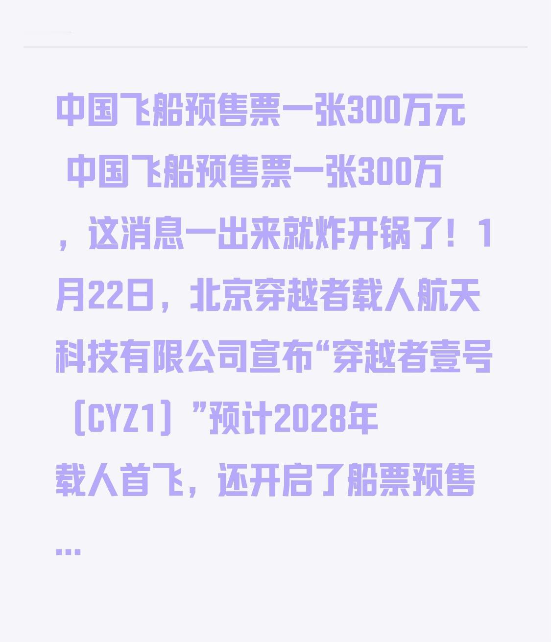 中国飞船预售票一张300万元 中国飞船预售票一张300万,这消息一出来就炸开锅了!1月22日,北京穿越者载人航天科技有限公司宣布“穿越者壹号(CYZ1)”预计2028年载人首飞,还开启了船票预售。预付10%就能锁定名额,目前已经有超三艘船、20余位游客预定。 首批签约游客来自各界,有中国工程院院士李立浧,演员黄景瑜也将成为009号太空游客,他说很荣幸能坐咱中国人自己的飞船去星海。300万一张的船票不便宜,但能体验太空游,对很多人来说也是一辈子的梦想。不知道这太空之旅会啥样,真让人期待!