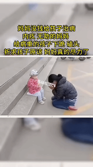 医院门口的一跪看哭全网:妈妈给重病孩子磕头道歉,孩子的反应更戳心。 在医院门口的台阶上,这一幕让无数网友破防。 一位妈妈跪在冰冷的水泥地上,对着面前年幼的孩子一下一下磕着头。她花光了所有积蓄,带着孩子四处求医,却还是凑不齐后续的治疗费。 她愧疚到了极点,只能用这种方式向孩子道歉,一遍遍地说着“对不起,妈妈救不了你”。 让人泪目的是,孩子没有哭闹,只是伸出小手轻轻拍了拍妈妈的后背,像个小大人一样安慰着这个比自己还要无助的妈妈。 这一跪,是妈妈走投无路的绝望,也是母爱的重量。我们总说为母则刚,可在命运面前,妈妈也会脆弱到不堪一击。 愿每个孩子都能被命运温柔以待,也愿这位妈妈能等来希望。母亲的下跪 生活 生病