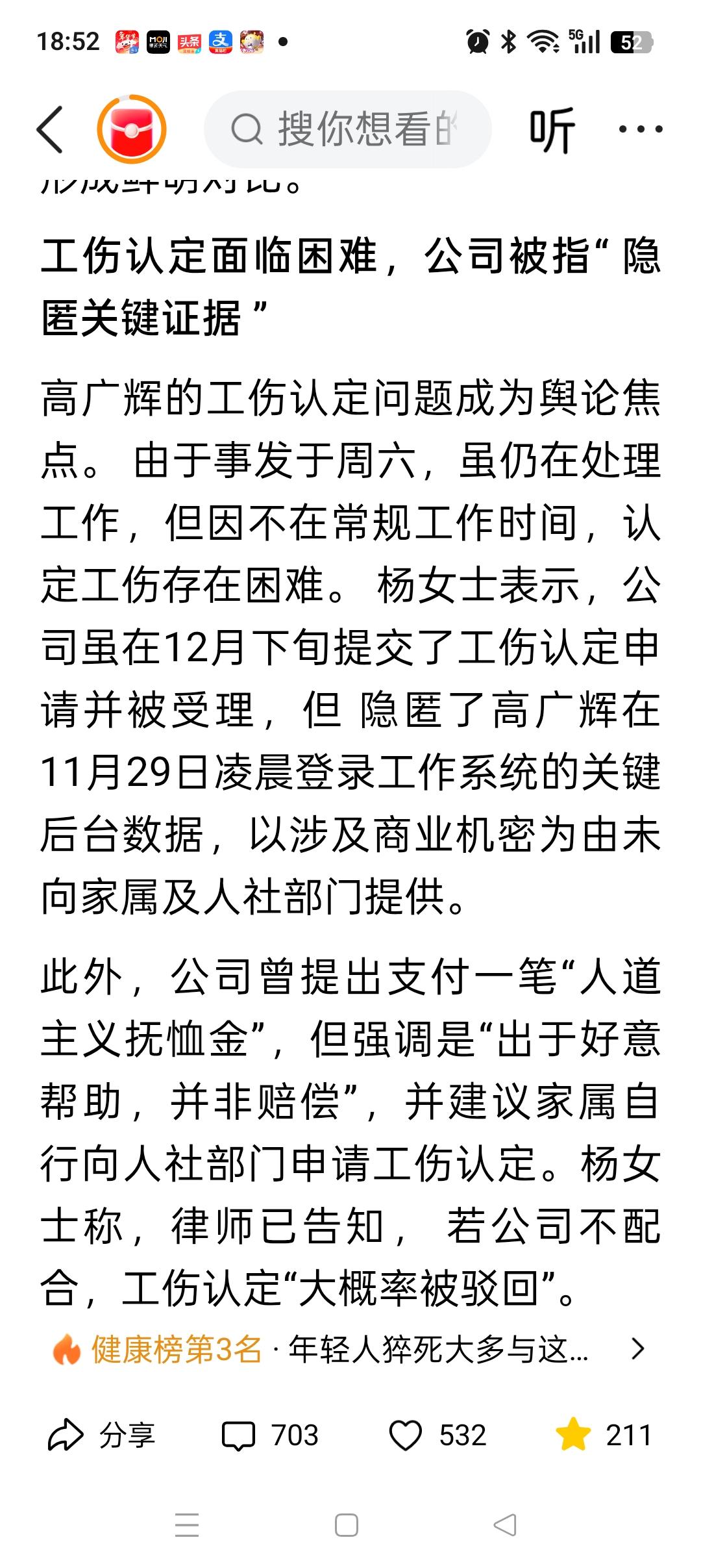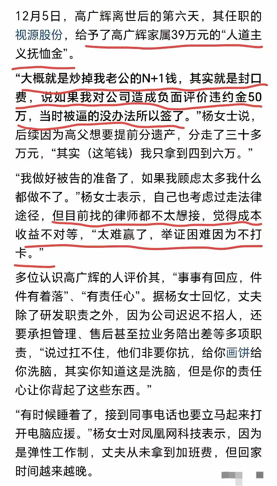 大家想多了,以为视源股份会给高广辉赔个上百万,实际上却只有39万。而且还强调是“出于好意帮助,并非赔偿”。 高广辉的妻子说:律师也告诉她,如果公司不配合,大概率无法认定工伤。 因为当天高广辉属于放假,虽然也在处理公司的事务,但是无法提供一些关键的信息。(公司以涉及商业机密为由并没有向家属和有关部门提供) 高广辉担任部门经理,底薪只有3000块钱,但一个月到手能拿到19000元。只因为他多劳多得,每天早上7点起床,晚上23点下班,即使上班的路上也要时刻回复公司的信息,一个人干着6,7人的活,太累了。。 目前这个补偿金额显然高广辉妻子是无法接受的,但是想要得到自己想要的结果需要付出极大的努力,祝福她。。