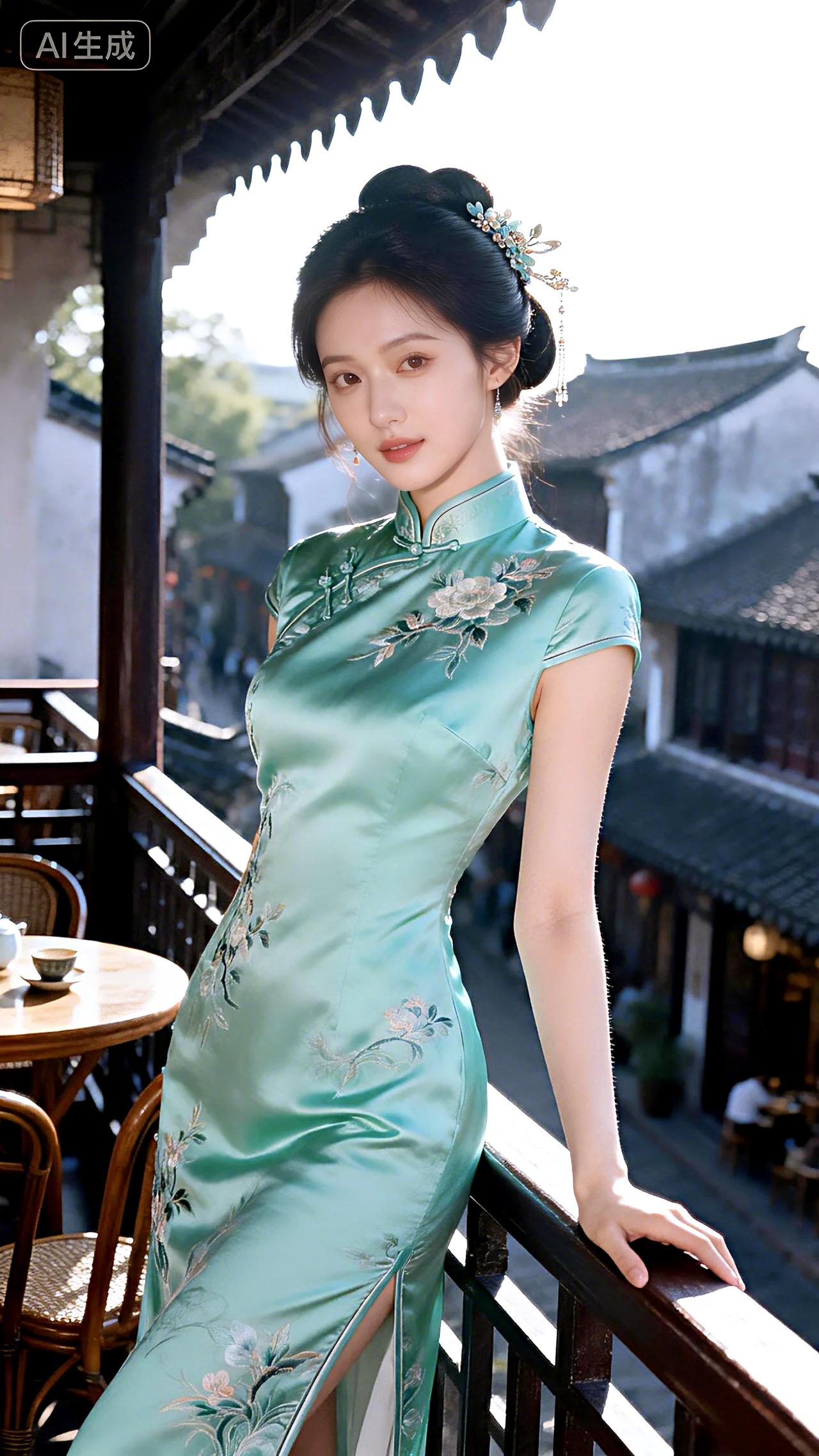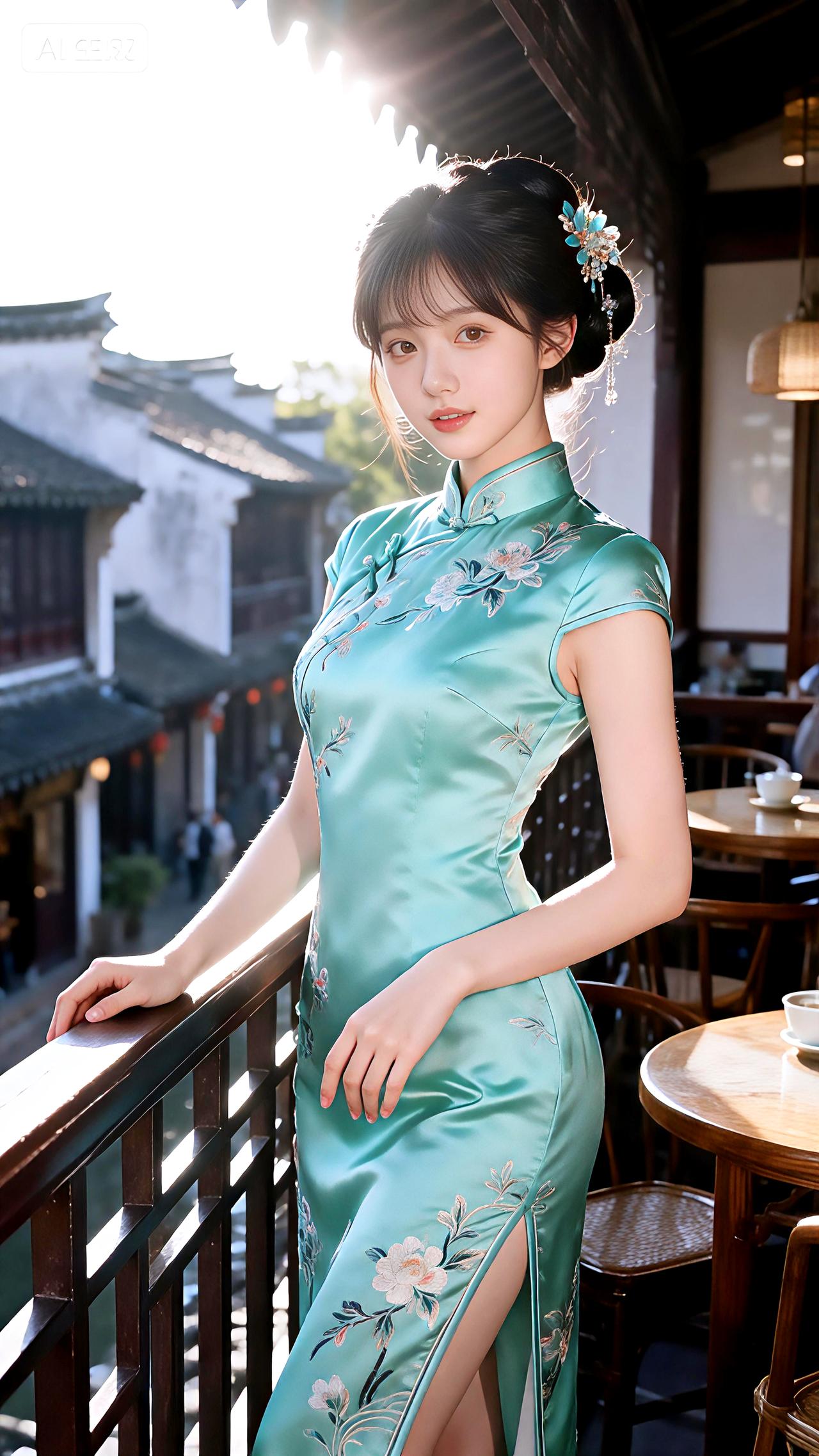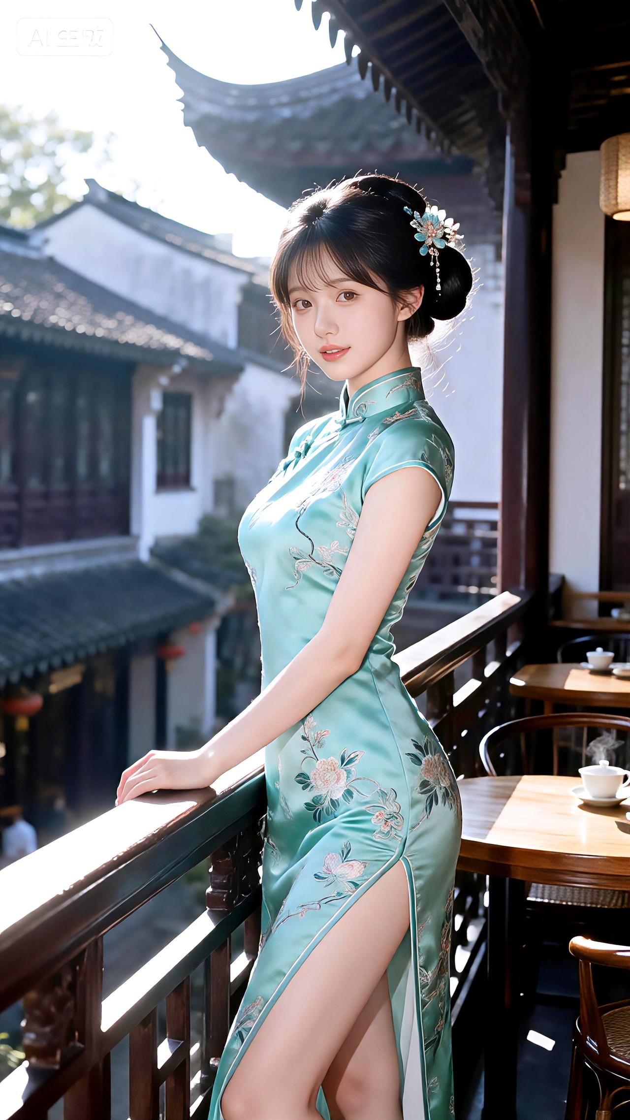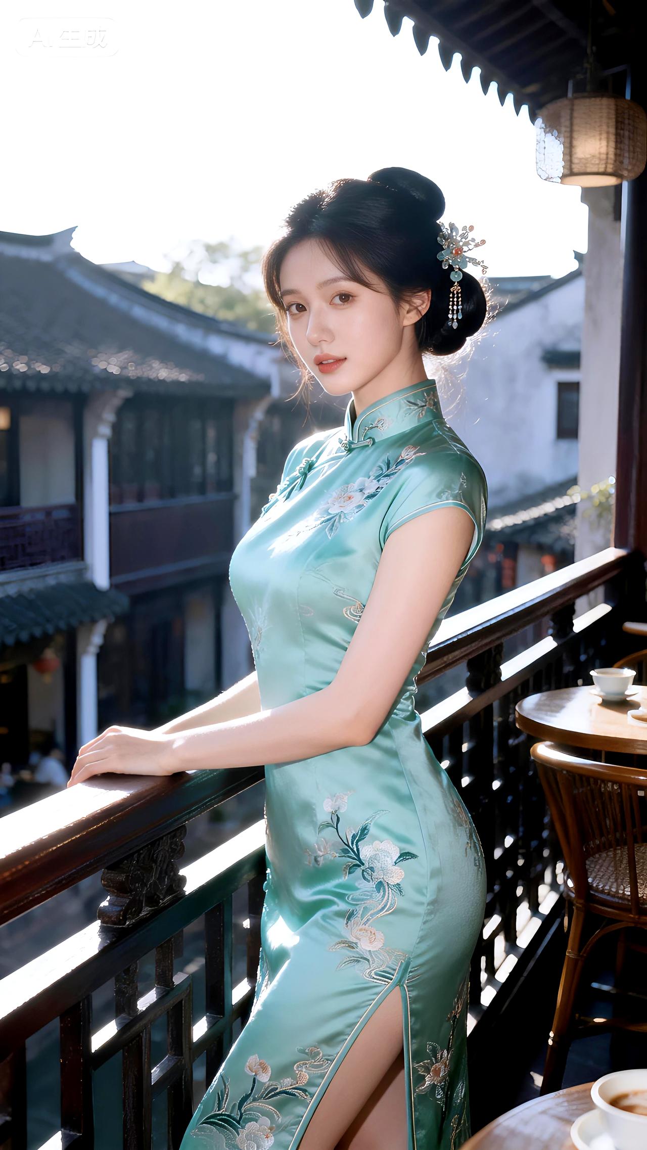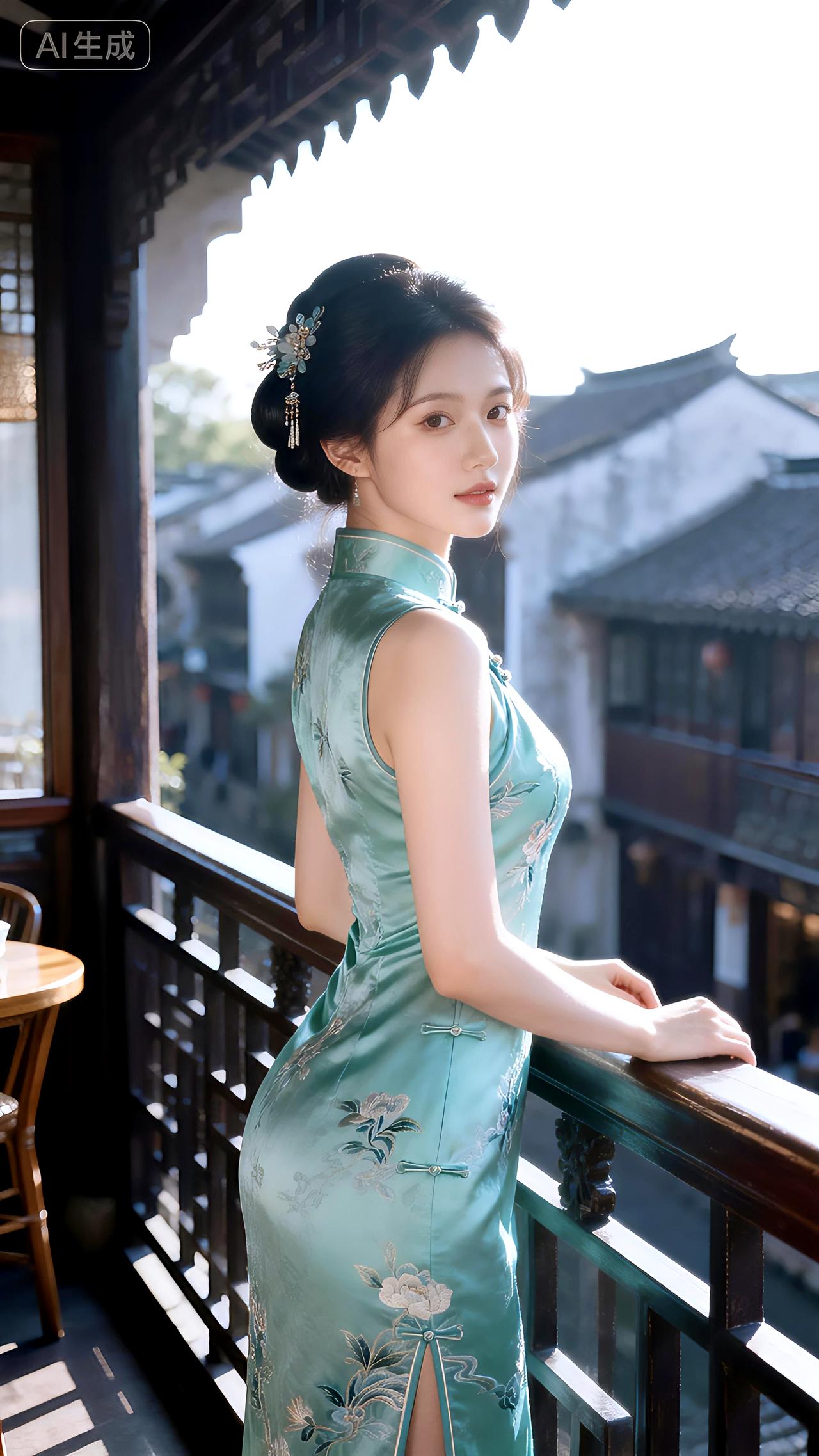 烟雨茶楼瓷青影,凭栏凝眸似江南。豆包 壁纸 写真
