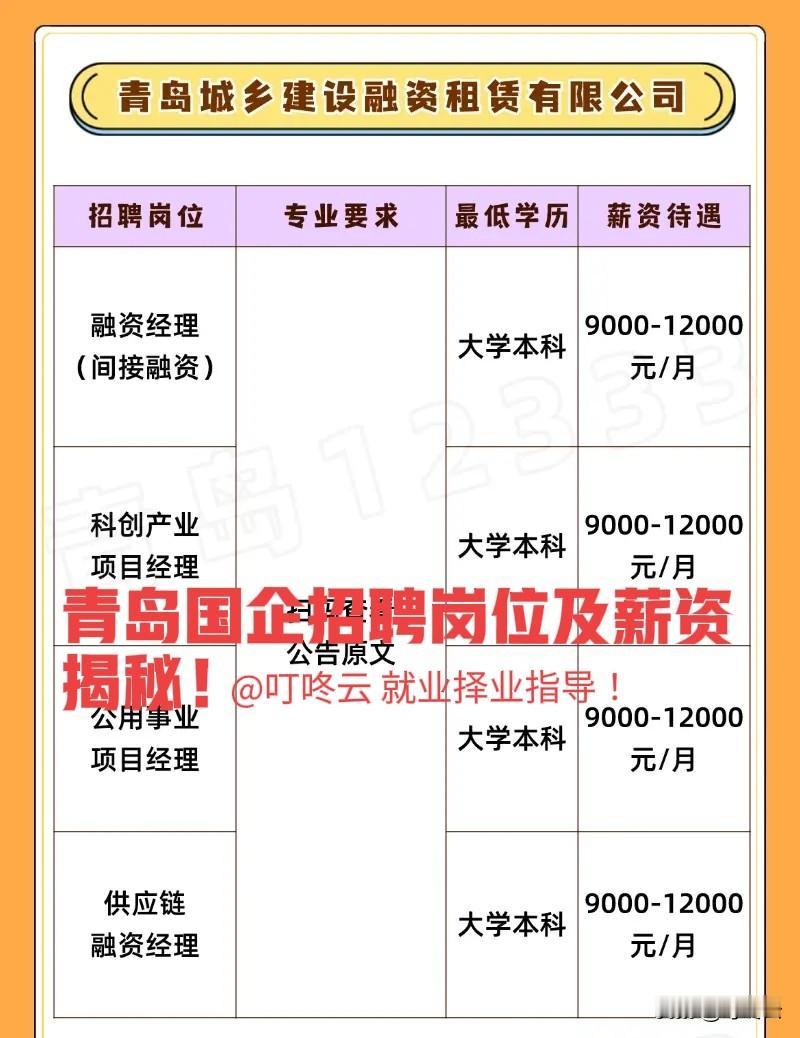 三箭齐发!山东青岛3家国企招聘岗位及薪资汇总揭秘!速速收藏!青岛城乡建设融资租赁公司、青岛青铁商业发展公司、山东碧海科技公司招聘岗位可选,薪酬待遇好。速速围观揭秘详细内容![点亮平安灯][点亮平安灯][烟花][烟花] 欢迎关注@叮咚云 将优先为粉丝职业规划指导,1对1咨询是付费服务,为你定制最适合的就业择业方案!欢迎留言交流讨论。[来看我][来看我] 免责声明:图片来自网络,仅供参考!