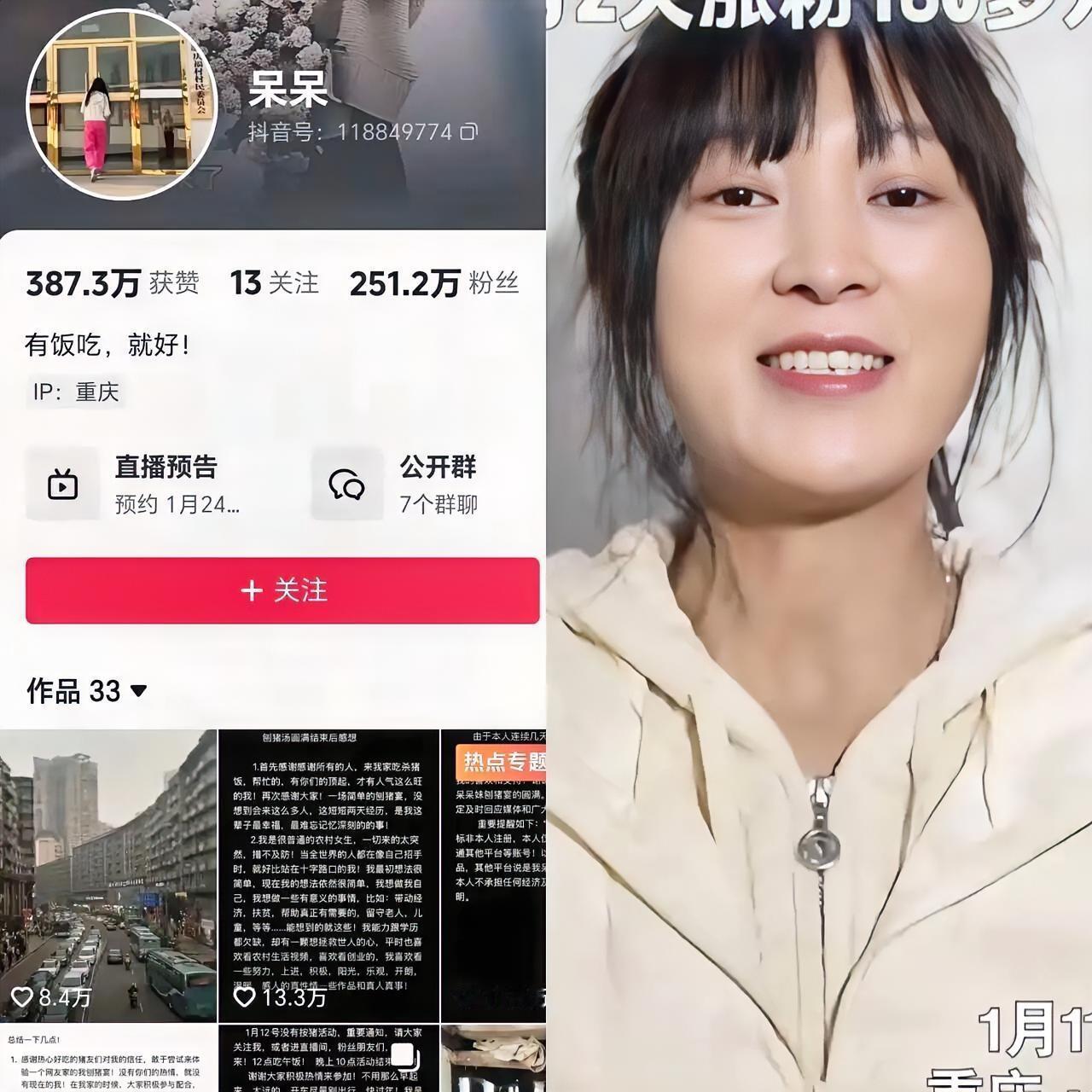 不出意外的话, 呆呆在1月24号又要火了! 不是因为她要去台湾了, 而是她的主页说了,1月24号要直播,但是具体是直播什么就不知道了。 刚暂退网没几天的重庆姑娘呆呆,突然官宣直播,直接让全网粉丝炸开了锅!谁也没想到,这个凭刨猪汤走红的农家女孩,会这么快重回镜头前,未知的直播内容,让期待值拉满。 23岁的呆呆是重庆合川庆福村人,此前只是个普通美甲师,一条喊人帮忙按猪的方言视频,让她从不足500粉丝,三天暴涨到200万+,一夜之间成了全网热议的乡村网红。 走红后刨猪汤现场人气爆棚,线上直播间最高16万在线,可她却果断暂退网,停掉所有直播采访,拒绝打赏和商业签约,这份流量面前的清醒,还被人民日报点名点赞。 人红是非多,仿冒呆呆的账号遍地都是,17个相关商标被连夜抢注,还有人跟风办刨猪汤闹出各种乱象,反观呆呆,始终守着乡村的一方小天地,不被流量裹挟。 她的烟火气还飘到了海峡对岸,台湾同胞特意组团到庆福村赴约,还真诚邀请她去台湾看看,这件事甚至被国台办提及,成了两岸同胞温情互动的暖心小事。 此次呆呆官宣1月24日直播,明确标注“纯内容、零销售”,不带货不开橱窗,彻底打消了大家的顾虑,没人猜她会搞花样,毕竟大家喜欢的,从来都是她的纯粹。 网红圈里太多人追着流量捞快钱,丢了初心,而呆呆却守住了最珍贵的真诚,不管这次直播是唠家常还是看乡村日常,相信粉丝都会满心支持,因为这才是大家真正想看到的人间烟火。 各位读者你们怎么看?欢迎在评论区讨论。