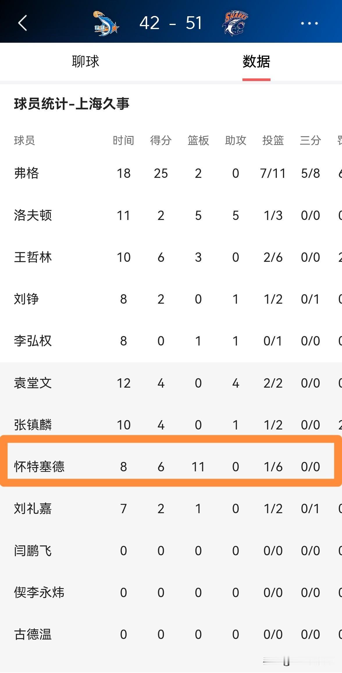 上海久事外援怀特塞德真是太与众不同了!在今天上海久事客场挑战福建晋江文旅的比赛中,目前双方半场战罢,上海久事以51:42领先对手9分。在前两节比赛中,怀特塞德替补出战8分钟,投篮6中1,其中罚球4中4得到6分,还有11篮板1抢断,其中包括7个前场篮板,他的场上正负值为+5。 怀特塞德真是一名与众不同的球员,他的前场篮板竟然比得分都多,这样的球员真是太少见了。