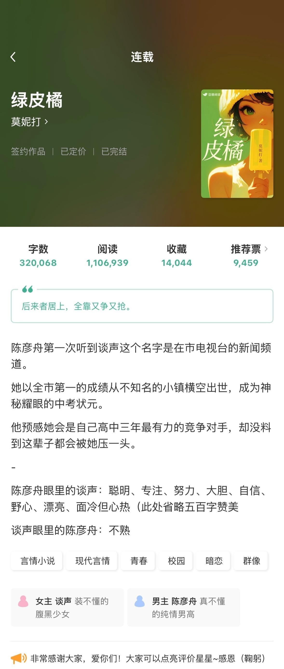 《绿皮橘》莫妮打谈声x陈彦舟校园群像/ 暗恋成真好甜的一本校园文,咧起的嘴角就没下去过!!女主谈声是横空出世的中考状元,打断了男主陈彦舟一直以来的第一名神话。她因为生病做手术延迟了入学,因此班上的人只听过她的名字却没见过她人,更不清楚她的性别,就连男主做的多个预设里,也以为她是男生。而就在班上的同学在为她争论的时候,她默默地装了个大的告诉众人她就是谈声哈哈哈哈。女主其实并不想装,她就是有这么一股大佬的气质,加之她其实也有那么一点的促狭,想看众人的反应~女主是很可爱的性格,她自信从容,从不掩饰自己的野心,对自己的实力也十分的笃定,能够在不知不觉中成为朋友们的主心骨精神领袖。当然她也是有点冷幽默的,时不时地就会一本正经的搞笑~她的自信源自于她的聪明和能力,她想要的终归会得到。男主从一开始就对女主这个抢了他第一名的神秘人很感兴趣,也被女主激发的斗志。他最初也会把女主放在一个需要被照顾的位置,但被女主点出后便真正理解了女主,学会尊重女主,和女主的竞争也全力以赴,即使每次都败给女主,做个万年老二。男主真的是一个非常会自我攻略的人,女主只是呼吸他都觉得女主在勾引他哈哈哈。而女主又是一个天然钓系,不知不觉中男主就被她逗得神志不清,完全不知道自己走进了女主的圈套,被拿捏得死死的。女主喜欢他的赤诚、热烈和纯粹,也很爱逗他,非常享受这种男主被她逗得脸红耳赤的纯情样,只是每当这个时候女主又会暗骂男主是来坏她道心,想抢她第一名的哈哈哈哈~上了大学后男主才终于敢去追女主,此时他的抖M属性也完全展露无疑,自从他们开始暧昧后女主就很喜欢扇他,对于男主来说估计就是「比巴掌先到的是掌风送来的属于谈声的气息」吧~男主肯学各种花样来取悦女主,可女主一提他就开始害羞脸红,这是什么纯情小狗啊~哦对,男主还很喜欢哭嘿嘿🥵高中校园日常部分也很有意思,他们的同学都挺好玩的~pick你心中的改编潜力王微博年度待改编IP评选