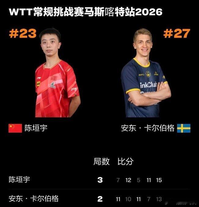 陈垣宇3比2胜卡尔伯格WTT马斯喀特站,陈垣宇在总得分落后的情况下,硬生生拼到决胜局,以3-2逆转击败瑞典名将安东·卡尔伯格!前两局对手火力全开,陈垣宇一度陷入被动,但他稳住节奏,在关键的第五局顶住压力,以15-13拿下胜利,用一场硬仗证明了自己的韧性!从落后到追平再到绝杀,这就是国乒小将的血性!