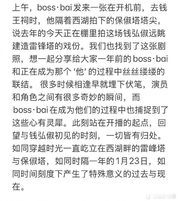 白宇一年前就在看基建 谁能想到,一年前就在看基建了哈哈哈,去年在西湖看的风景竟成了钱弘俶的起点。保俶塔见证了他与角色的双向奔赴,也让我们看到了演员对角色的用心打磨白宇