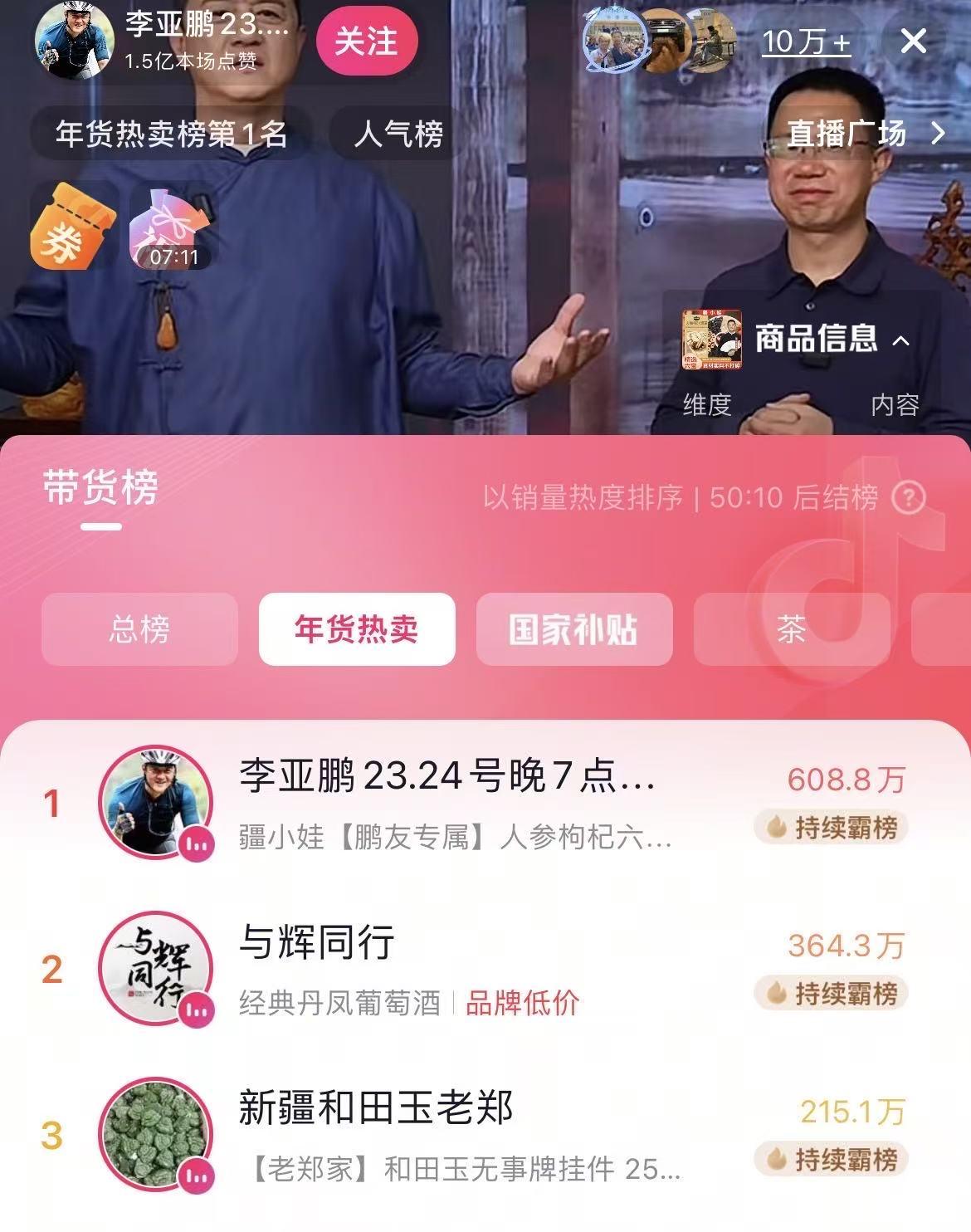 李亚鹏直播间强势登顶年货热卖榜冠军! 1月23日晚,李亚鹏开启直播带货,吸引超10万人同时在线观看。在推介一款普洱茶时,他呼吁观众理性消费:“来捧场的朋友就别买了,把商品留给有需要的人。” 直播间网友们热情高涨,纷纷在评论区喊话:“别聊了,赶紧上链接!”[大笑] 据年货热榜数据显示,李亚鹏直播间强势登顶榜首,销售额断崖式领先第二名“与辉同行”。