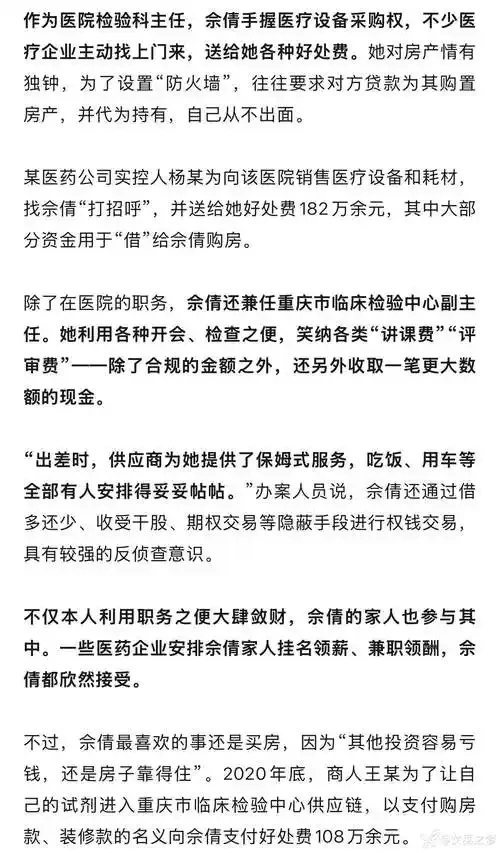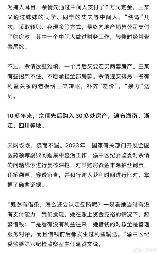这并非影视剧桥段,而是重庆市某医院检验科原主任佘倩(化名)落马时的真实一幕。 谁能想到,一位曾被誉为“业务骨干”、拿过无数荣誉的医生,竟在10年间悄悄购置30多套房产,遍布海南、浙江、四川等地?更令人咋舌的是,她自以为天衣无缝的“防火墙”,最终成了把她送进监狱的铁证。 她不是没钱,是太“精”。 作为检验科主任,手握医疗设备采购重权,佘倩成了医药商眼中的“香饽饽”。但她反侦查意识极强——不收现金、不直接转账,而是玩起了“代持”“借款”“合伙投资”的把戏。 一套房,她只出5万“定金”,剩下的几百万,由医药商通过层层中间人“代付”。为了掩人耳目,钱款甚至绕道妹妹的同学、同学的丈夫,连转账都故意带尾数,伪装成普通资金往来。 她甚至让两家老板“接力”送房——一个掏不起,另一个补差价,上演一出“腐败拼单”的荒唐戏码。 更讽刺的是,她一边收钱,一边还在“讲课费”“评审费”上斤斤计较。 出差有供应商全程保姆式服务,吃饭用车全包,私下再塞几万“辛苦费”。家人也挂名领薪,全家“共腐”。 她坚信:“其他投资会亏,只有房子最稳。”于是,用权力换房本,用良知换资产,一步步从“白衣天使”沦为“腐败病毒”。 可再狡猾的狐狸,也逃不过猎人的眼睛。 2023年,全国医药领域反腐风暴掀起。渝中区纪委监委抽丝剥茧,比对资金流向与利益输送时间,发现她所谓“借款”对象,全是管理服务对象,且账户长期充裕却频繁“借贷”——这哪是借钱?分明是披着合法外衣的受贿! 面对铁证,曾经气定神闲的佘倩终于崩溃。2025年3月,她因受贿1042万余元,被判十年六个月,罚金百万,赃款全退。 这起案件,撕开了医疗腐败“市场化、隐身化”的遮羞布。 我们敬佩医生,是因为他们与病魔作战;我们痛恨腐败,是因为他们把手术刀变成了收割机。当“救死扶伤”变成“借权生财”,再高的专业,也不过是作恶的工具。 更值得警惕的是:这类“有借条的受贿”正在成为新型腐败手段。 你身边有没有类似“看似合法、实则违规”的利益输送?你认为,该如何斩断医药采购背后的“隐形链条”? 💬 欢迎在评论区留下你的看法!