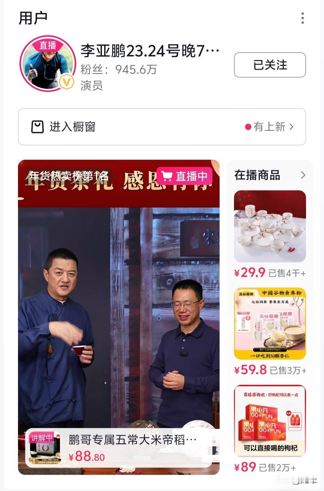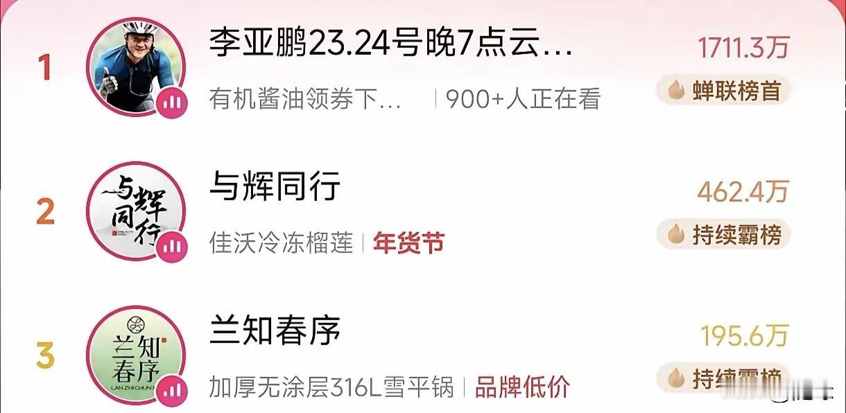 不出意外的话 李亚鹏会成为2026年最火的主播,短短几天时间,粉丝涨到了945.6万,距离千万主播就一步之遥了。 今晚直播间人气火爆,一单难求,人数一直维持在十万➕,冲到带货榜第一名,远超“与辉同行”。 现在,不管李亚鹏买什么,不管他讲不讲品,网友就一个字“抢”。 为什么大家疯狂为他“下单”? 因为大家都知道他赚钱的用途,所以心甘情愿为他买单。