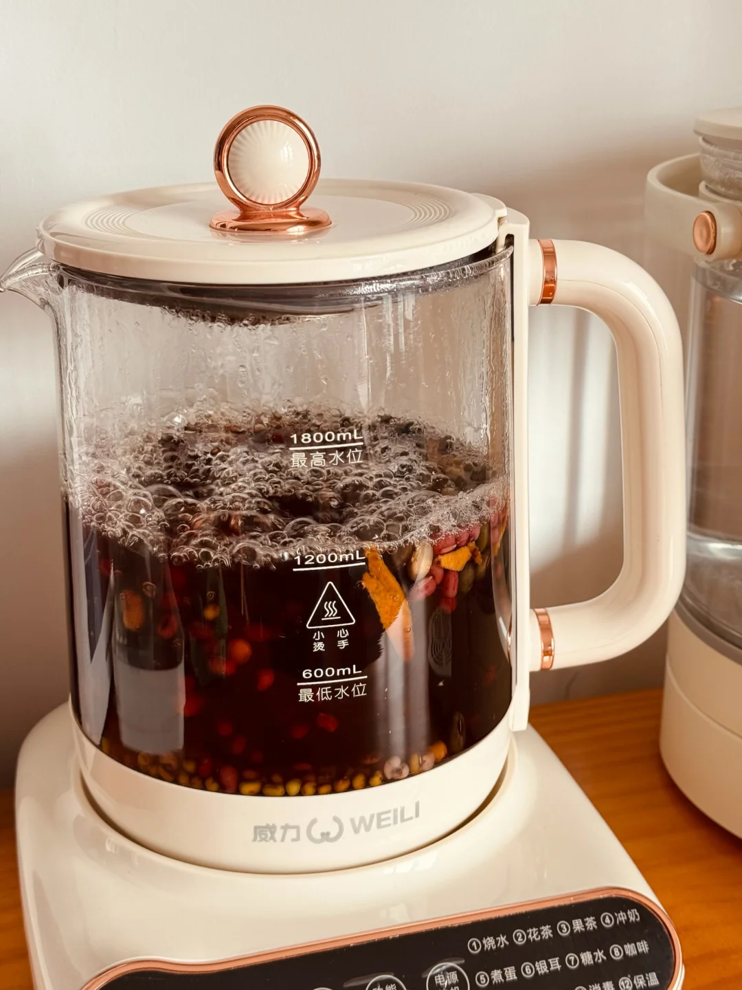 3. 所有材料放入养生壶或砂锅,加1500ml清水,大火煮开后转小火煮40-50分钟,至豆子软糯、汤色深浓即可。