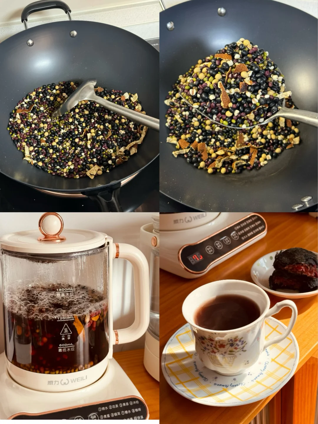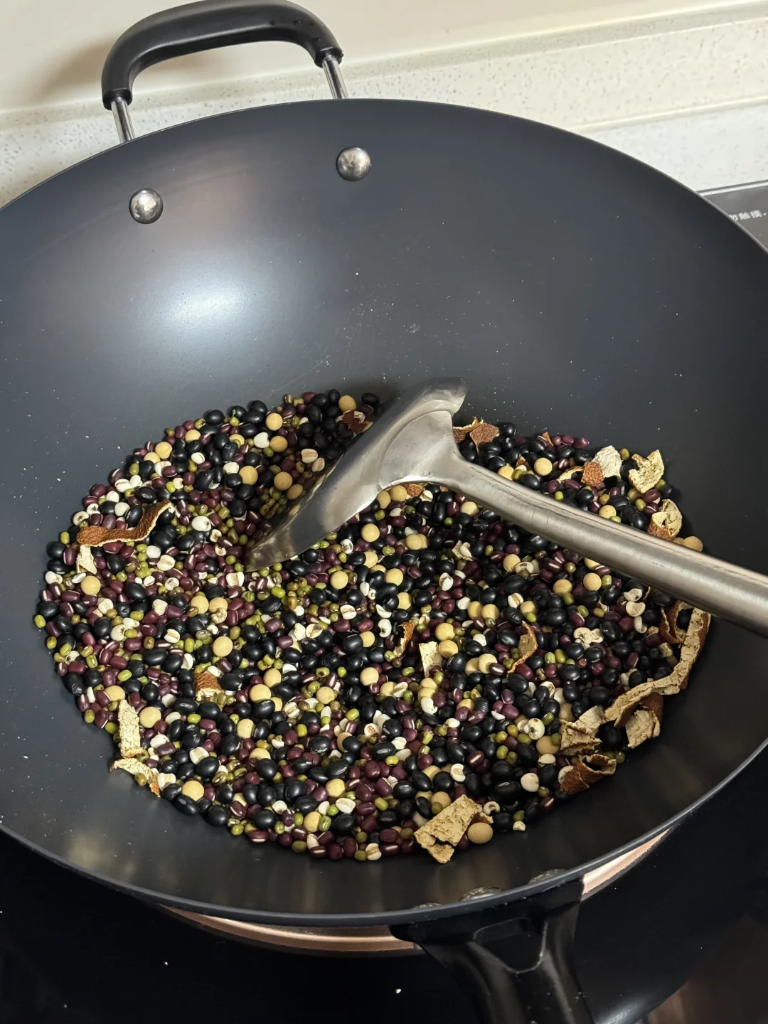 1.干锅烧热,放入四种豆子和陈皮,小火翻炒8-10分钟,炒至豆子表面微黄、散发焦香即可。炒过的豆子能减少寒凉性,更温和健脾。