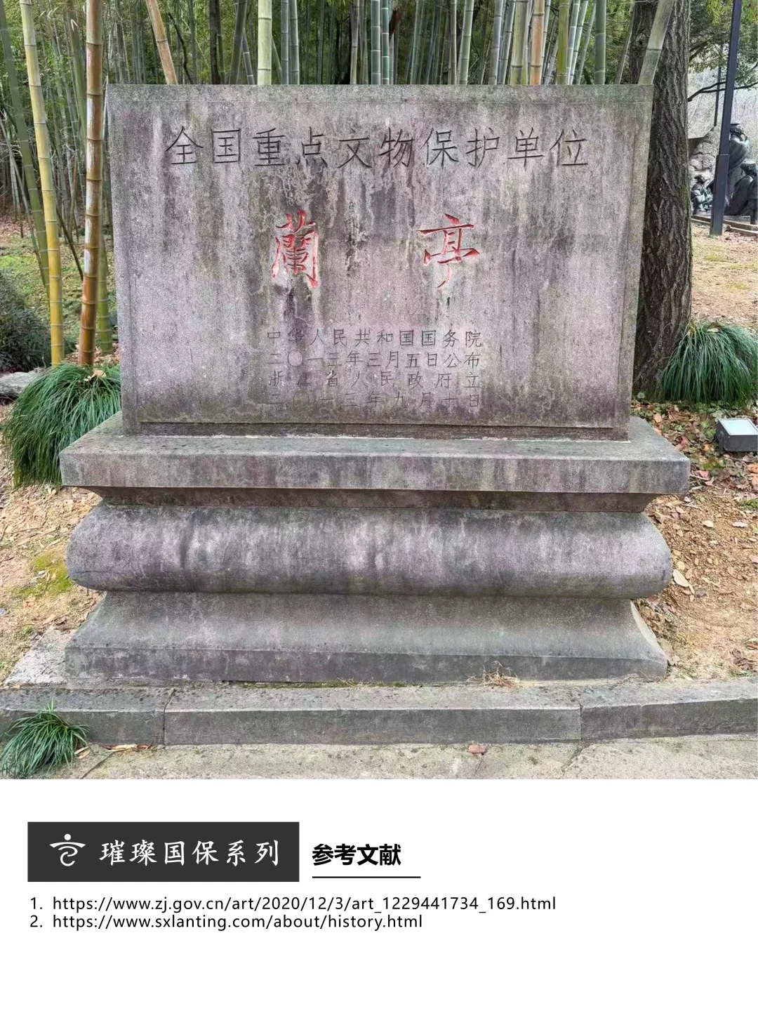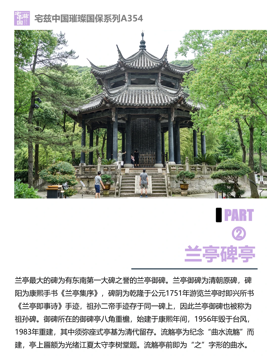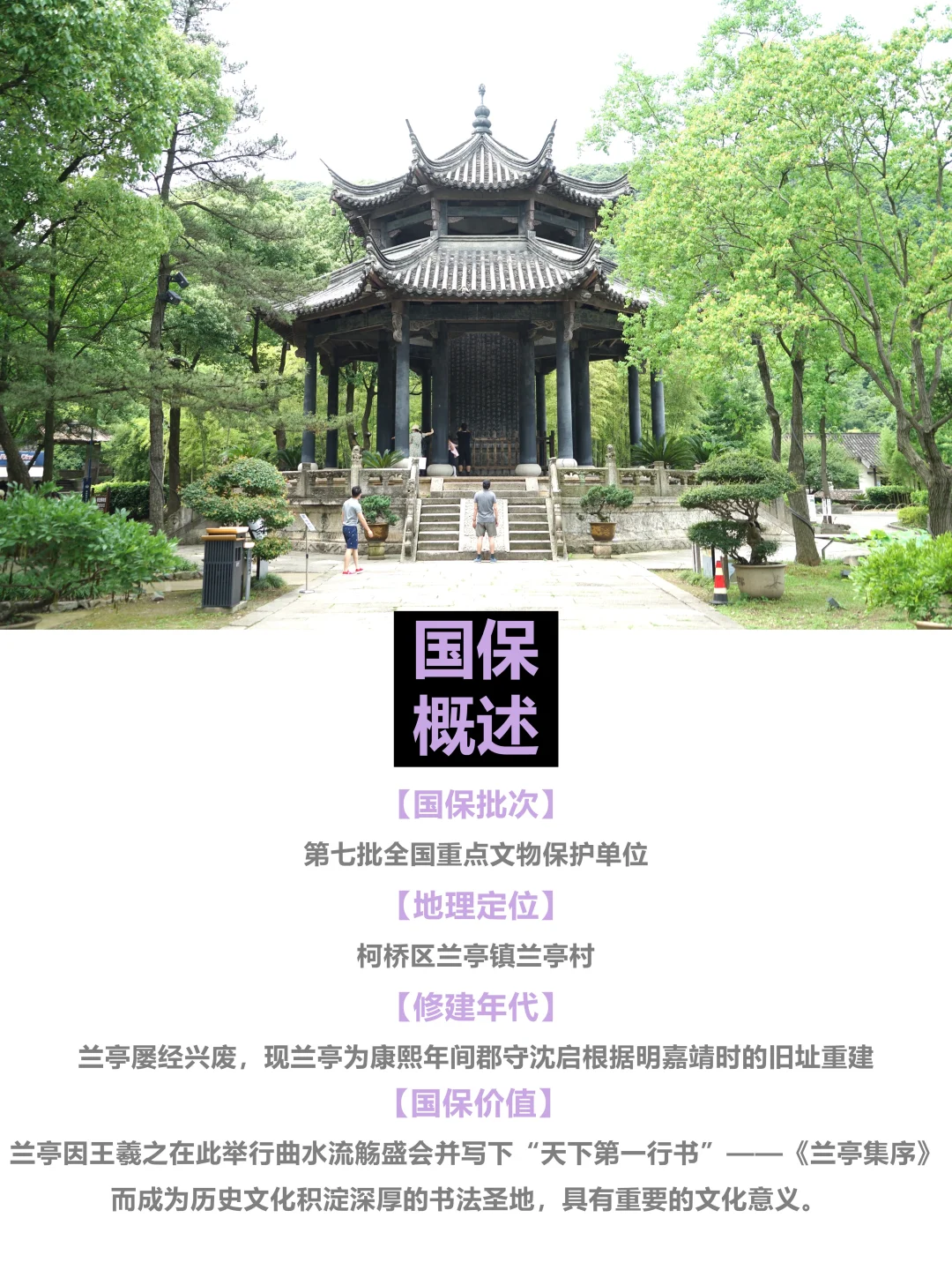 兰亭因越王勾践种兰于此并且汉代建有驿亭而得名。东晋永和九年(公元353年)三月初三,王羲之邀请谢安等41位文人贤士在兰亭修禊,临流泛觞,赋诗抒怀,写下了被后人誉为“天下第一行书”的《兰亭序》,兰亭从此成为中国书法历史上的文化圣地。历史上的兰亭原址几经兴废变迁,现兰亭为康熙年间郡守沈启根据明嘉靖时的旧址重建。兰亭现存清朝康熙御笔兰亭碑以及康熙和乾隆御笔的兰亭御碑,此外,还有兰亭碑亭、御碑亭、王右军祠等古建。