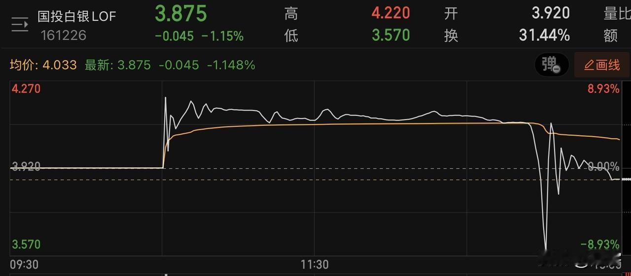 国投白银LOF今天的走势相当刺激,过山车坐了三次,如果在地点买进,周末情绪不削减再加上国际白银价格突破100美元,那么目前溢价50%的前提下,下周一还可以搏一搏大涨的机会。 看今晚黄金的5000美元大关、白银100美元大关是否会突破创造历史。