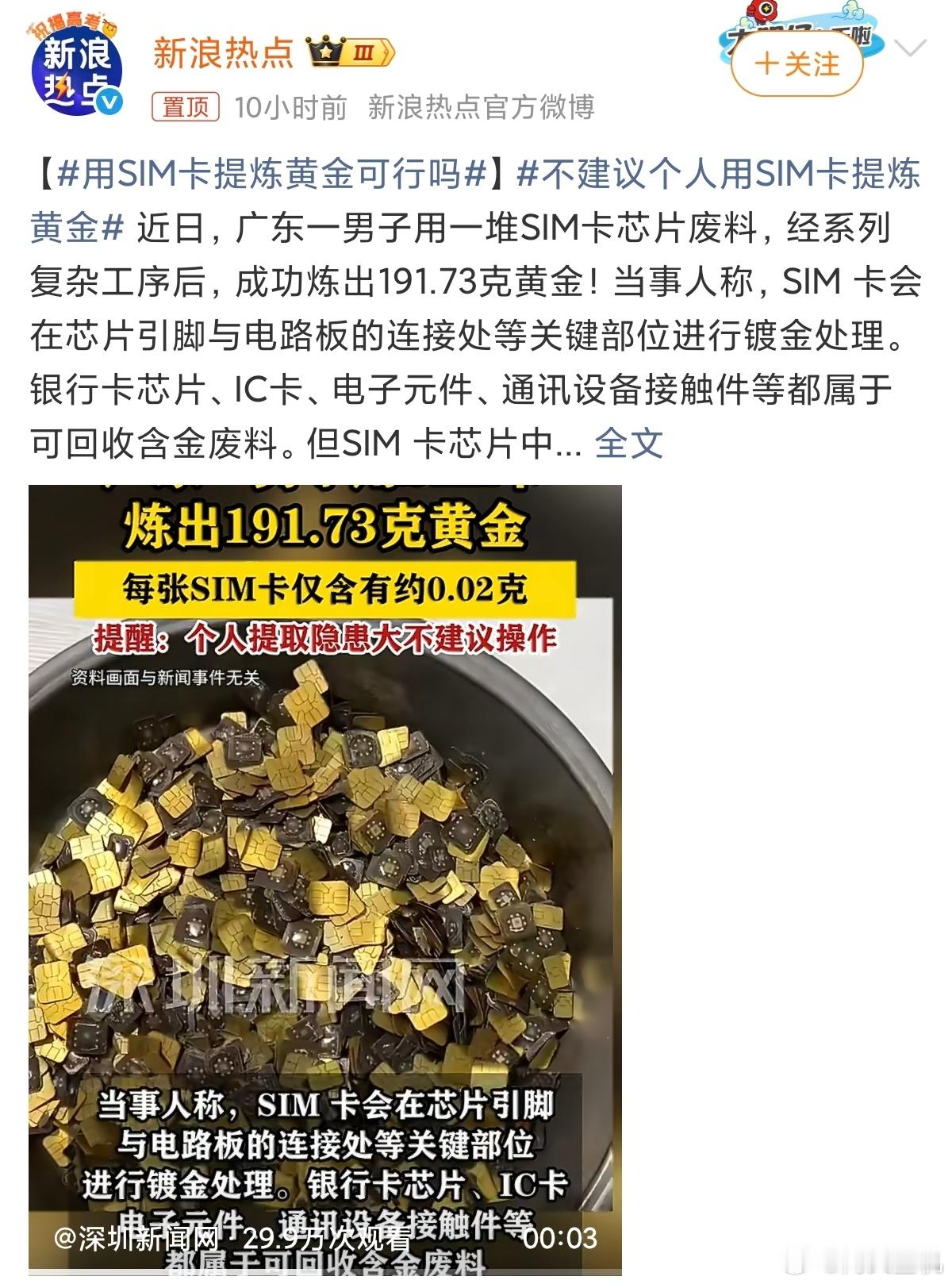 不建议个人用SIM卡提炼黄金感觉纯属扯淡,每张卡也就0.0几克,没啥钱,对于个人来说怎么收集那么多卡都是问题,况且也不不提倡个人提炼sim卡里面的黄金,一方面会产生许多有害气体和物质,造成环境污染,对整个社会来说得不偿失。