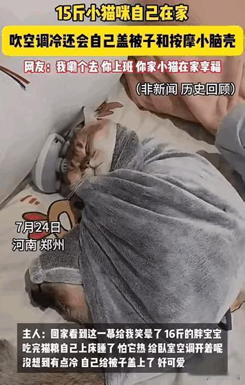 “成精了!”一女子出门去上班,结果下班回家一看,女子惊掉了下巴!留15斤的猫咪在家,担心它热得慌,特意开上了空调。这猫不仅会给自己盖被子,还会按摩脑壳! 这猫简直就是成精了,是彻底坐不住了!李女士每天早出晚归去上班,家里就剩这只体重15斤的金渐层“壮壮”独享空调房。 没想到这小家伙在家一点不闲着,竟自学成才,捣鼓出了一套独家“猫式享乐攻略”,那天李女士提前下班,推门一看,眼前的一幕差点让她惊掉了下巴。 这家伙正舒舒服服地窝在沙发上,不仅自己把小毯子扒拉过来盖得严严实实,还把那颗硕大的脑袋搁在按摩仪上,左右磨蹭,那叫一个行云流水,熟练得让人心疼! 这事儿说白了,壮壮完全是把李女士当成了免费的“五星级酒店管家”,你要以为它只会盖被子和蹭按摩仪,那可就小看它了。 这小东西平时就在暗中观察,早就把主人的生活习惯摸了个门儿清,学了个透彻。 李女士每天出门前的流程雷打不动:空调恒温26度,水碗粮碗填得满满当当,生怕这位“猫大爷”受一点委屈,她在外面辛苦搬砖挣钱交电费,这猫倒好,在家里过得比谁都滋润。 重点是,壮壮才三岁,体重已经飙到了15斤,走起路来晃晃悠悠,像个成精的煤气罐,平时猫粮罐头换着花样吃,吃完就懒得动弹,活脱脱就是个被“富养废”的典型。 那天李女士本来想搞个突击检查,给猫咪个惊喜,结果一进门,好家伙,客厅空调冷风嗖嗖的,沙发正中间一团肉球裹着薄毛毯,只露出一颗圆滚滚的脑袋,眼睛眯成一条缝,那一脸享受的表情,比做了大保健还销魂。 最绝的是,那毯子盖得极有讲究,边边角角都塞好了,专门护着肚皮,生怕着凉,李女士站在门口愣了半天:“合着我担心你在家孤单寂寞冷,结果你过得比我都精致?” 正当她掏出手机准备录下来的时候,更离谱的操作来了,壮壮听到门口有动静,懒洋洋地抬起头,估计是觉得脖子酸,顺势就把脑袋往旁边的按摩仪上一枕,还左右来回蹭动,那动作娴熟得像个老师傅。 李女士当场笑喷:“好小子,你还会给自己做头部按摩呢?”被吵醒的壮壮懒洋洋地瞥了铲屎官一眼,眼神里写满了“大惊小怪”,然后头一低接着蹭,那条毛茸茸的大尾巴还得瑟地晃了两下。 视频一发到网上,网友们瞬间炸了锅,有人调侃:“这哪是猫啊,这是披着猫皮的大爷吧?开空调盖被子,这可是人类夏天的顶级享受,全让它占了。” 还有人酸溜溜地说:“我看它是真懂生活,你在外面累死累活赚钱,它在家岁月静好当名媛,分工挺明确啊。”更扎心的是有网友吐槽:“我都还没用过头皮按摩仪,活得不如一只猫。” 其实从科学角度看,猫咪的模仿能力和智商确实不容小觑,金渐层本来就聪明,观察力特别强,它们能通过观察主人的动作,学会开门、按开关这些技能。 壮壮这套操作,归根结底就是长期观察李女士学来的,李女士自己在家也是空调房盖薄被,没事用按摩仪放松,猫咪看在眼里记在心里,时间长了自然有样学样。 虽然觉得好笑,李女士也开始反思了,这猫15斤确实超重了,对关节和心脏都不好,她下定决心,以后下班不管壮壮愿不愿意,都得强行拉着它玩逗猫棒,不能再让它这么“葛优躺”下去了。 毕竟健康才是享受生活的基础,别看网友们吐槽得欢,李女士对壮壮那是真爱,除了空调常开,家里还装了监控。 上班空闲时候,她就爱偷看自家猫主子在干嘛,有时候看见它发呆,还会对着麦克风喊两声。 虽然壮壮大概率是个白眼或者是根本不搭理,但李女士心里踏实,她说养宠物就像养孩子,只要看着它过得舒坦,自己干活都有劲。 也有细心网友担心猫天天吹空调会不会得“空调病”,李女士早就有准备,26度不冷不热,每天出门前还会开窗通风半小时换气。 下班回家第一件事也是关空调开窗,还在客厅放了盆水加湿,所以壮壮虽然胖,身体倒是倍儿棒。 现在壮壮已经养成习惯了,只要李女士一出门,它立马开启“度假模式”,扒拉毯子护住肚皮,找个硬东西蹭蹭脑袋,怎么舒服怎么来。 李女士坦言,每天拖着疲惫身子回家,一推门看见这胖乎乎的小家伙在那等着,所有的累好像一下子就没了。 说到底,猫咪这些看似成精的举动,其实是因为在家里有足够的安全感,它知道这里安全、舒适,知道主人宠它,所以才敢这么肆无忌惮地享受生活。 这其实是一场双向奔赴:铲屎官负责在外打拼提供好生活,毛孩子负责在家可可爱爱,治愈你的不开心。 看着壮壮这15斤的肉身裹在毯子里,你就会明白,幸福有时候真的很简单:有空调吹,有毯子盖,还有个愿意宠着你的人。 你家猫有啥成精的举动?评论区来聊聊,看看谁家的主子更会享受!