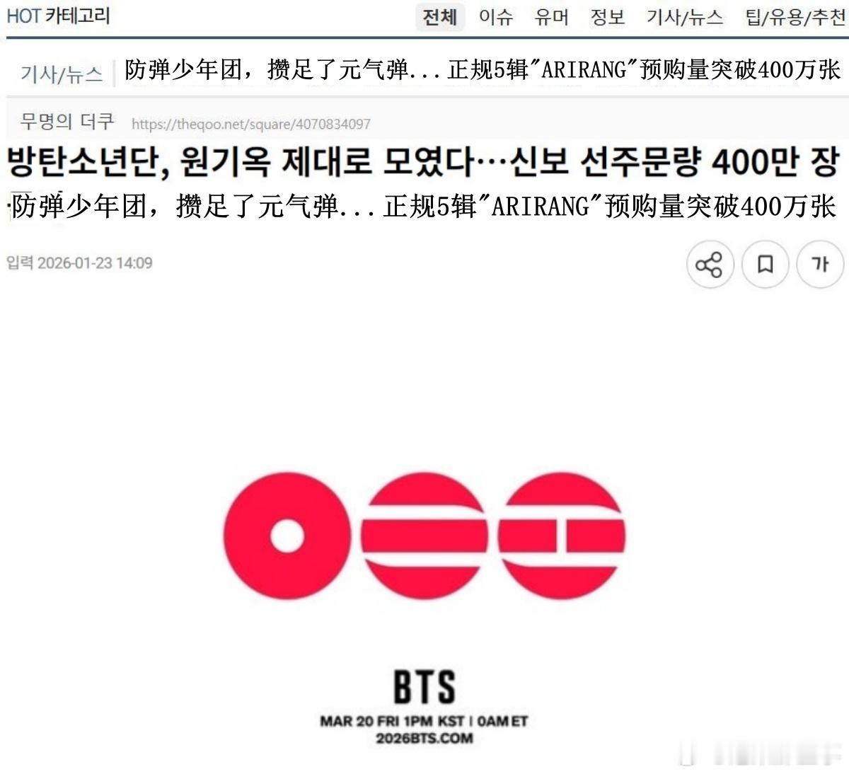 🔥韩网热帖评论翻译🔥BTS新专辑预售突破400万张据韩媒报道,专辑流通商YG Plus23日透露,防弹少年团正规5辑《ARIRANG》16日开启预售,截至22日预购量已突破406万张。这一成绩已经超过了组合累计销量最高的正规四辑《MAP OF THE SOUL : 7》。该专辑于2020年发售,首周预购量达342万张,累计销量突破了500万张(以Circle Chart为基准)。cr.theqoo