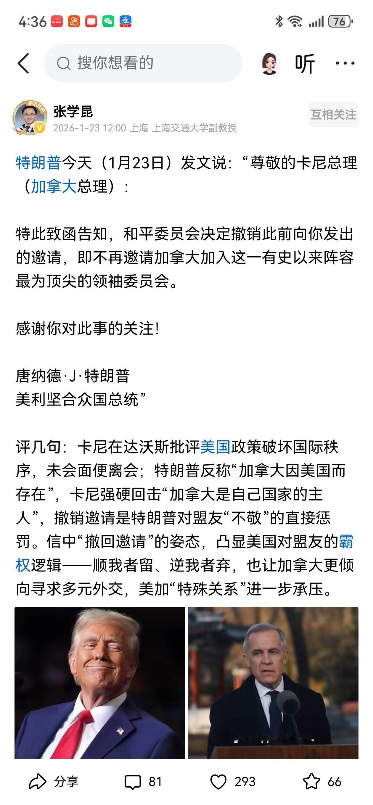 特朗普今天(1月23日)致函加拿大总理卡尼称:“尊敬的卡尼总理:特此致函告知,和平委员会决定撤销此前向你发出的邀请,即不再邀请加拿大加入这一有史以来阵容最为顶尖的领袖委员会。感谢你对此事的关注。" 卡尼非但未对特朗普发起的所谓“和平委员会”积极响应,反而在达沃斯论坛上批评美国破坏现有的国际秩序,令特朗普恼羞成怒,随即取消了卡尼的“入会资格”。其实不仅加拿大对这个“三无产品”漠不关心,就是欧洲的主要盟友对此也不屑一顾,均认为注定是一场政治闹剧。美国一边成立所谓的“和平委员会”,一边又妄图吞并丹麦领土格陵兰岛,并把加拿大地图涂上美国国旗,严重践踏了两国的主权和领土完整,这是对“和平”二字的莫大侮辱。