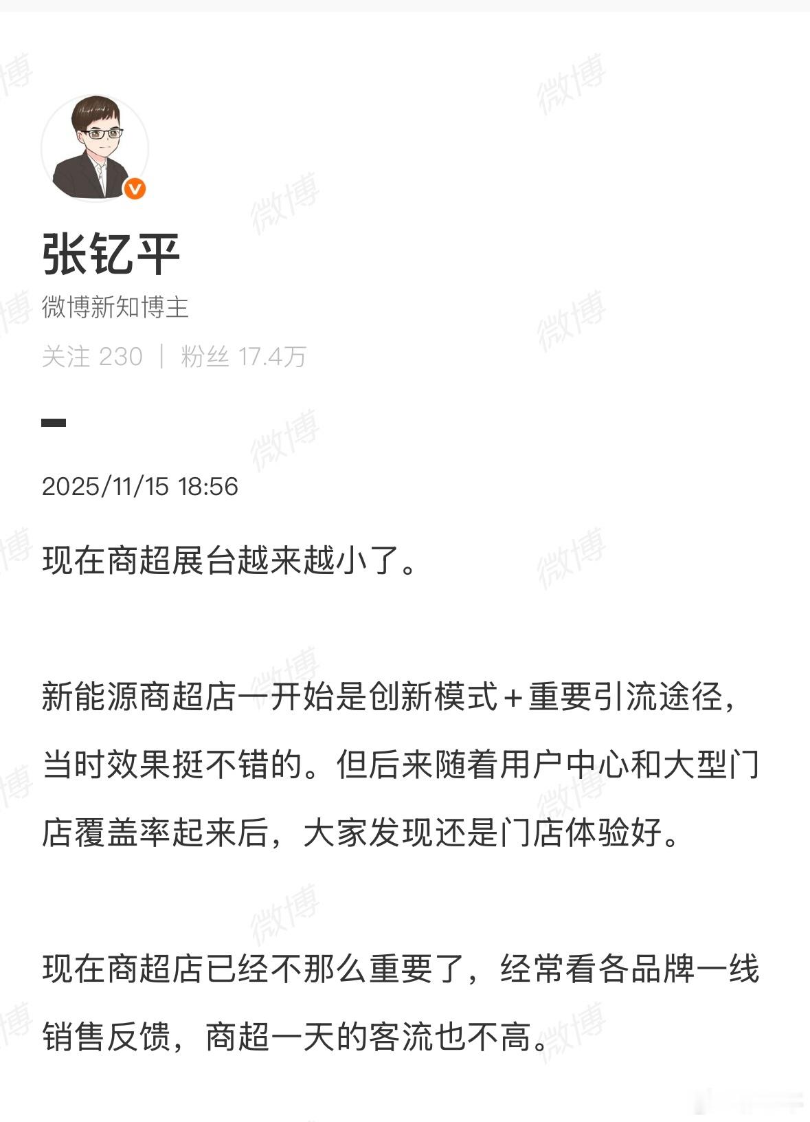 理想汽车将关闭低能效门店别把这个事看得多可怕,经常逛商场的同学都知道,近几年各品牌都在陆续减少商超店,转为更类似传统4S店模式的用户中心。商超店有历史积极意义,比如获客、覆盖量、规模化等,但每一个成长起来的品牌,面对的都应该是更全面完善的用户服务,所以无论售前售后,商超店都不如用户中心更便利。这个事我之前聊过。我不明白的一点是,很多品牌都在执行的规划,也持续了两年了,咋理想突然被拎出来推上热搜了?搜到了辟谣信息但没找到官方出处,暂且不谈,如果属实,那基本就是这个思路。新能源汽车大v聊车