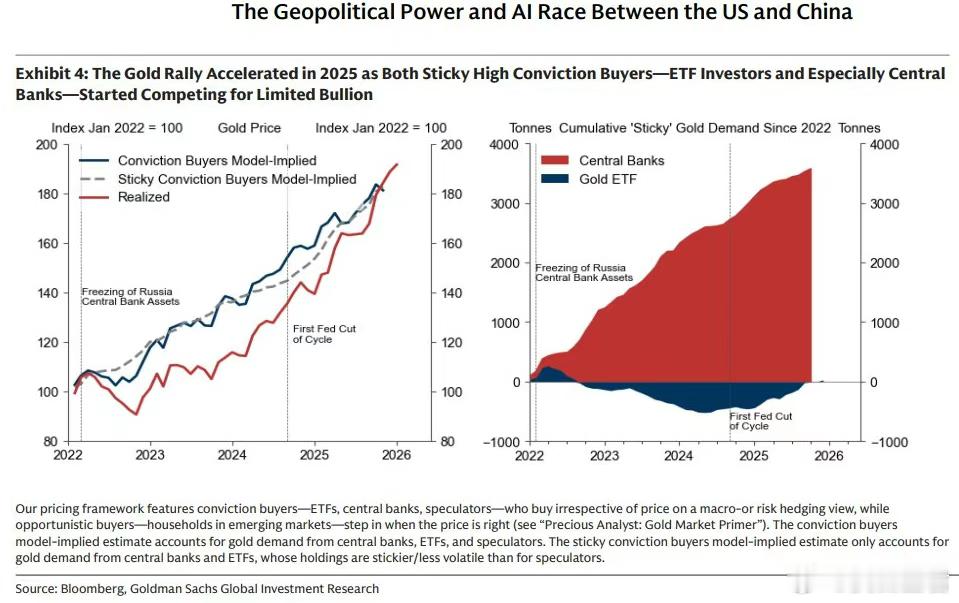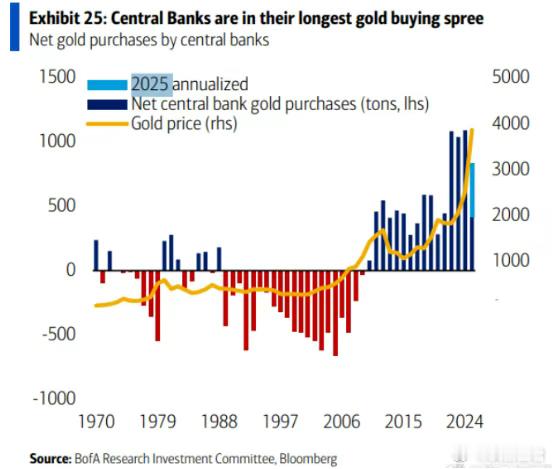 通胀不起,周期不止。。刚刚过去2025年,贵金属的涨幅非常惊人,黄金白银的价格都创下了历史新高。最近一段时间甚至很多人,拿这轮黄金价格上涨和上世纪七十年代那轮上涨做对比。这些人认为,黄金价格这几年的涨势虽然很强劲,但比起1970年代末近乎垂直的飙升还差得远。我个人确实也觉得,贵金属上涨短期看还没有完全结束,因为现在驱动黄金上涨的主要因素已经变了。在过去很长时间里面,影响黄金价格波动的主要因素,是美元的利率走向。这个事情我们在2022年五月的《贵金属见底了么》讨论过,而且当时说后续可能还会再下行一段。实际情况确实也是这样,从22年五月到十一月,我们看到金价是持续下行的。转折点出现在22年十一月,这个月之后黄金价格的转折点出现了,之前的持续下行开始逐步转为上行。出现这个变化是因为,在2022年俄乌战争开始以后,欧美西方国家通过制裁冻结了俄罗斯的外汇储备。到了这个阶段决定黄金价格因素更多的,变成央行和各国百姓对黄金的购买。各国央行大量购金的原因也很简单,俄乌战争开始以后,西方国家冻结了俄罗斯的外汇储备。这种情况发生以后,各国都觉得万一开仗岂不是自己的外汇储备也可能会被冻结。在这种情况下,出于对自身外储多元化和安全的角度考虑,不少国家都开始了黄金的持续购买。买入从俄乌战争开始不久之后开始,然后在2022年下半年反应在黄金价格上。这就是为啥我们会看到,央行的购买成为这个阶段推升金价上涨的主要动力。从下面这张图看其实就很明显,中央银行购买的黄金也就是红色区域,呈现出持续增长的的趋势。央行有动力配置更多的黄金,是由于地缘政治不确定性和俄罗斯资产冻结等因素的驱动。图中的蓝色区域,主要是黄金ETF对黄金的累积需求,这部分更多的是居民投资需求。对比就可以看出,作为一种更加灵活的投资工具,ETF需求虽然重要,但中央银行的需求驱动是更加显著的。从时间节点来看的话,2022年是新兴国家央行开始加大黄金购买力度的元年。原因是俄罗斯中央银行资产冻结带来的影响,这一事件显著影响了黄金市场。这之后很多新兴国家央行开始加大黄金储备,以对冲政治风险和货币不稳定。所以从2022到2024年黄金的上涨,主要是就是央行买金和投资需求的驱动增长很快导致的。这部分新增的市场购买力,开始竞争市面上有限的存量黄金。但是黄金因为开采难度大,每年产量带来的新增长却很有限,后面到2024年下半年金价上涨开始加速,除了央行的购买还有个原因是美联储在经济周期中开始降息。过往黄金的走势和美元利率走势负相关,所以伴随着美联储降息,又会吸引更多的买家进入市场。所以本轮金价的上涨,是始于新兴市场国家央行强劲买金需求,进而涨价吸引散户投资者入场。然后在美联储降息之后,伴随着央行的继续坚定买入,以及更多新买家带来的增量需求,然后价格上涨就开始加速了。从统计数据上看,目前的央行的黄金购买,过去两三年是有记录以来持续时间最长力度最大的。而且到目前为止,这两类买家都没有看到从过去的购买,转为净卖出的迹象。在这两类买家转向之前,黄金上涨的趋势暂时还不会停,不过中间的调整在所难免就是了。其实如果把时间轴拉得更远,你会发现新兴市场国家的央行开始买黄金,是从经历了全球金融危机之后开始的。那时候美联储为稳住全球经济开启量化宽松,引发了大家对美元纸币购买力贬值的担忧。于是这些央行在这之后持续增持,总持有量相比危机前翻倍,到4亿多盎司。不过这个增持过程整体比较缓慢,对金价的推升是一个渐进的过程,并不像最近两年这么猛烈。转折点出现在2022年的俄乌战争,战争开始之后俄罗斯的外储被冻结以后。不少新兴市场国家央行因为担心外汇储备安全,对美元资产购入增速放缓,黄金购买却加速推进。伴随着金价回升,黄金储备的美元价值,已经大幅超越了其他以美元计价的储备资产(比如美债)。不过虽然黄金价格涨了这么多,新兴市场央行黄金购买开始趋于平稳。但是到目前为止依然没有迹象表明,这些新兴市场国家央行会大规模卖出黄金。因为西方冻结俄罗斯储备资产的先例,仍将影响其他国家,美元资产多元化配置的必要性并未减弱除了新兴市场国家,不少发达国家的央行其实也在重新启动黄金的购买。随着财政赤字创历史新高,法定货币贬值风险上升,增持黄金同样能为其带来收益。央行的购买也影响到了散户投资者,先是新兴市场的散户,之后北美和欧洲的散户也开始买入。可以说到现在为止,不管是央行还是散户的的买入,都还没有看到停下来或者转向卖出的的迹象。通常只有昔日的的黄金买家转为净卖出的时候,才有可能影响到整个上涨趋势。到目前为止这个因素并没有出现,所以现在就判断贵金属马上见顶转势,还是太早了。不过相比价格已经在高位的贵金属,我们可能目前更关注的是其他大宗商品和工业商品。刚刚过去的2025年,是贵金属在舞台上表演的一年,现在时间已经进入到2026年,我们觉得过去一年贵金属价格的上涨,可能只是这轮大宗商品上涨的序曲。因为很可能从2020年疫情以来,美国的的通胀走势会和70年代比较类似。一年多之前,我们在《牛回头还是大反弹》也聊过这个事情。当时说的是,降息以后拉长点时间,二次通胀可能会卷土重来。所以后续如