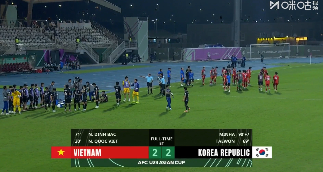 #u23亚洲杯季军战点球# 点球大战一触即发!加时赛战罢,双方依旧2-2战平!#u23越南2比2韩国u23##看u23亚洲杯上咪咕#
