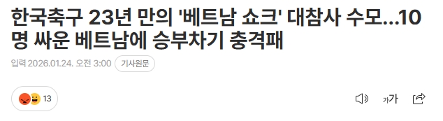 韩媒文章标题:韩国足球时隔23年遭遇“越南冲击”耻辱惨败……对阵10人作战的越南在点球大战中震惊落败。