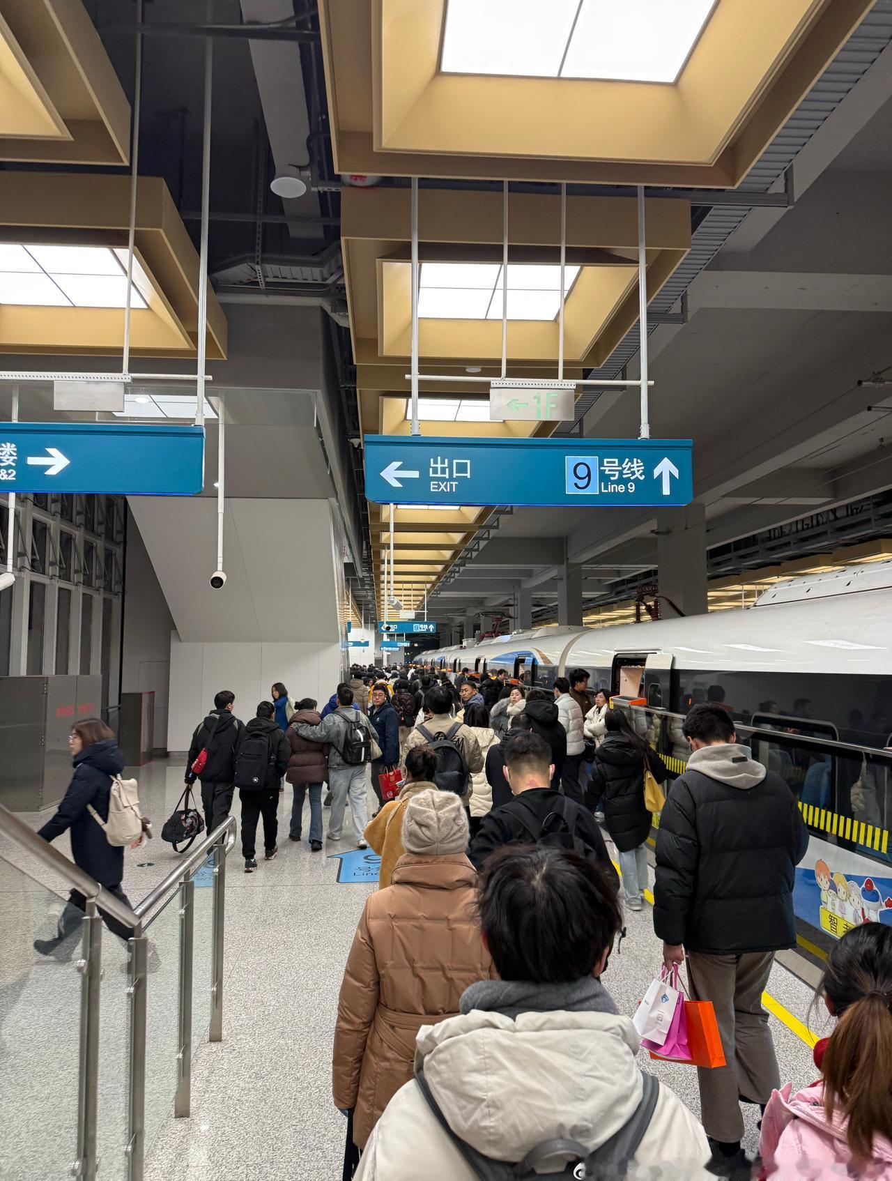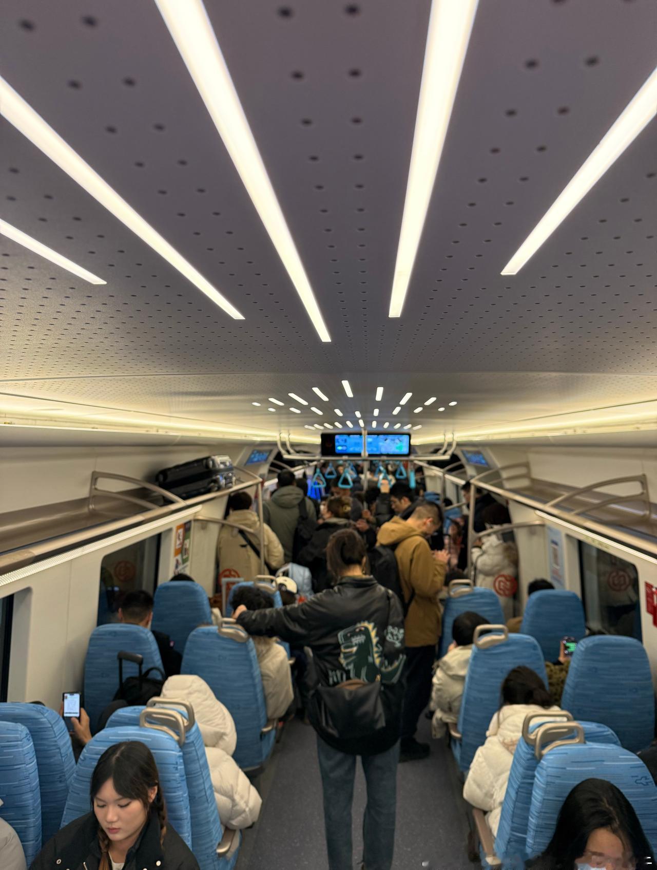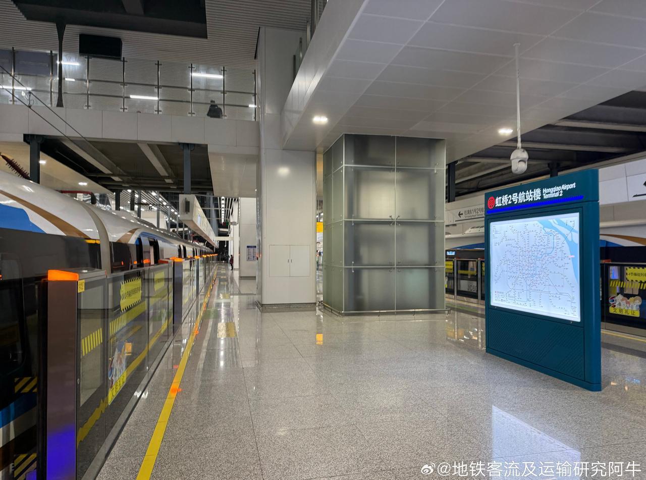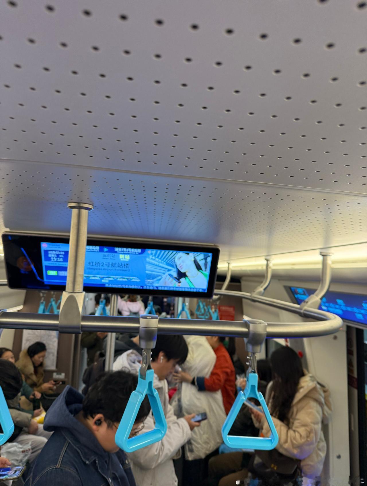 网友 @梅柚碱芥 分享上海地铁:2026年1月23日(周五),虹桥2号航站楼站乘坐市域机场线,19:15发车,站台(图1),8节编组车内非常拥挤(图2-3),到达中春路(图4)。本线路全天间隔15分钟。