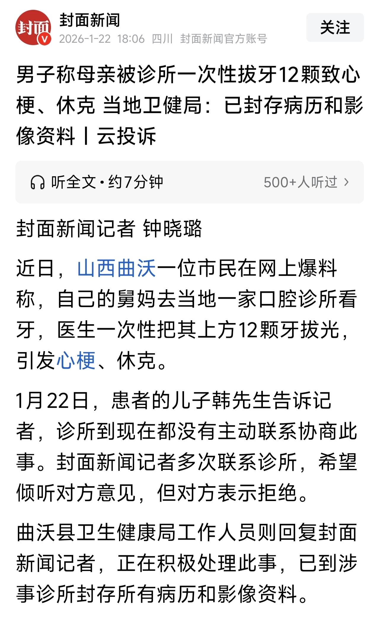 山西曲沃,一女53岁女子去口腔诊所种牙,医生告诉她拔3颗牙,却一次性把她上面12颗牙全拔光,导致女子下巴脱臼合不上了,嘴里血流如注,引发心梗、休克,直接进了ICU,人差点没抢救过来。诊所闯了这么大的祸,却一点歉意没有,还拒绝赔偿。在天眼一查这家诊所,结果惊呆众人。 韩先生的母亲只有53岁。但人没老牙先衰,上面的牙松动的厉害,硬一点的东西都吃不了,思来想去。她决定去种牙。 2025年12月17日,韩母在2个家人陪同下,去了一家牙科诊所,之所以选这家,一是因为这家诊所在当地小有名气,更重要的是,她家亲戚在那里看过牙,觉得很不错,她心里很放心。 牙医王某给韩母做了检查,告诉她上面的牙齿都松动了,如果种牙,就得都拔掉,当然了,所有牙齿不会一次性拔光,得分多次拔除。 但一次拔几颗?王某没又说,应该得根据具体情况,群体家属也没问,毕竟人家是专业牙医,心里有分寸,就签了告知书。 拔牙可不是小事,高血压,心脏病拔牙还有一定的风险,所以,韩母拔牙前,按要求得做心电图、血压、血常规等一系列检查,还好,一切都正常,诊所就安排给韩母开始拔牙。 拔牙用了2个多小时的时间,可结束后,直接把家属吓得不轻,因为母亲不行了,直接打了120把她送进医院抢救。 拔个牙而已,为什么事态急转直下,甚至危及生命?家属这才知道,母亲上面12颗牙全部一次性被拔光,而拔牙前,王某说过12颗牙分多次拔。 王某这么操作,直接导致韩母下巴脱臼合不上了,嘴巴里血流如注,整个人都不好了,被拉进一下一检查,拔牙导致急性心梗,生命岌岌可危。 这种情况,必须给韩母做心脏造影手术,但她嘴里不停的流血,即使输了抗凝血的药物,还是止不住,医生让韩母咽下去,可是胃受不了,韩母咽下去又吐了出来,直接昏迷不醒。 医院一看情况这么严重,不敢收治了,建议转院抢救,由心内科、肠胃科、口腔科三方会诊,韩先生都吓傻了,不敢耽搁,直接给母亲进行转院。 韩先生实在想不通,母亲就是拔个牙,怎么就变成这样了? 还好,韩母还算年轻,也没任何基础病,输血五六袋后,她被抢救过来,而她告诉韩先生,拔牙前,王某告诉她,当天只拔3颗,不知道他为啥一次性把12颗全拔了? 韩母住院20多天,以为恢复的差不多了就出院回了家,可万万没想到,到家就休克了,她又再次被送进医院。 如今的韩母,都下不了地,吃喝拉撒都需要看护,生活完全失去自理能力。 而让韩先生气愤的是,诊所从始至终,都装聋作哑,也没来医院看过韩母,就像韩母承受的一切,跟他们一点关系都没有,也没解释,为何一下子拔了12颗牙? 愤怒的韩先生请了律师追究诊所责任,但双方的赔偿金额一直没达成一致。 而此时的诊所,照常营业,也不发表任何回应,态度很是嚣张。记者给诊所打去好几个电话,对方都以负责人不再搪塞。 记者去天眼查诊所的信息,发现没有这家诊所的 具体工商信息,但有和这家诊所电话相同、地址相同,名称却有一字之差的口腔门诊部已注销。 据韩先生调查,其实这两家诊所是一家,他去诊所索赔的第二天,一字之差的那家诊所就注销了,法定代表人为王某,就是给韩母拔牙的人。 目前,相关部门已封存病历和影像资料,期待后续结果。 有人说,我妈拔牙,一次就一颗,7天后再拔下一颗,8颗牙拔了2个月,每次我带着去医院,长好后镶的满口,近80的老人,高血压,糖尿病,心脏病都有,拔牙没发生任何不适。 太吓人了,一定年龄一个星期只能拔一个,等拔的创囗好了,再拔一个,以此类推,这是一个比较负责任的牙医说的,去了另外一家看,牙医说有的牙齿松动,可以一天拔多个,这种牙医是很不负责任的,要安全第一。 韩母53岁正值壮年,原本只是想种个牙改善生活,谁能想到进了一次诊所,命都差点丢了,现在连自理能力都丧失,这哪里是治病,这简直是要命。 最离谱的地方在于那个医生王某。作为专业牙医,难道不知道一次性拔12颗牙是什么概念?对一个50多岁的人来说,这种大面积创伤引发的剧痛、失血和应激反应,足以摧毁整个身体机能。 拔牙前承诺只拔3颗,上手却把上牙床直接“清空”,这种违规操作直接导致老人下巴脱臼、大量失血甚至引发心梗休克。这不是简单的医疗事故,这是极度的不负责任。 更让人不寒而栗的是这家诊所的态度。出了事不道歉、不探望,甚至玩起了“金蝉脱壳”的把戏。 前脚刚被索赔,后脚就把地址电话都一样的关联公司注销掉,这种手段一看就是逃避法律责任的老手。一个连注册信息都玩猫腻的诊所,医德和技术怎么可能有保障? 医生不能为了图省事或者挣快钱,就把患者的生命安全当儿戏。正常的流程是一颗颗拔、等伤口长好再继续,这家倒好,直接搞“批发式”拔牙。 建议家属追究责任,既然相关部门已经封存了病历,那就通过法律手段申请医疗事故鉴定,查清王某是否有执业资质,诊所是否违规经营。 对此,你怎么看?