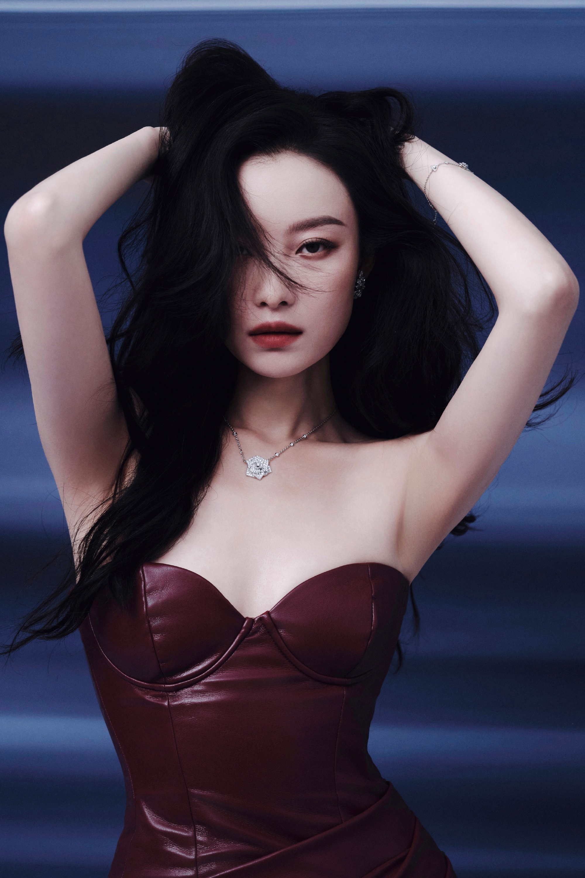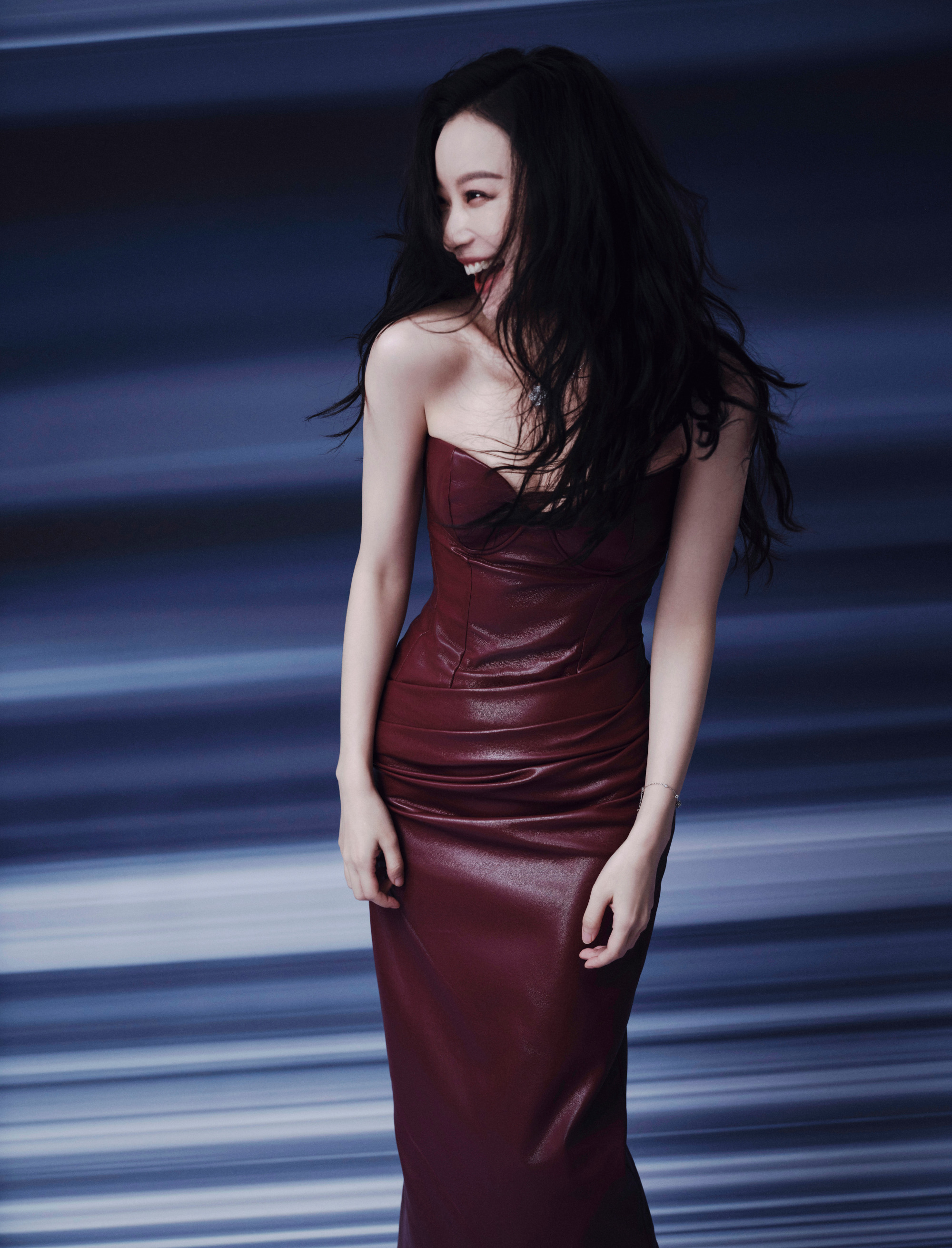 倪妮酒红色抹胸皮裙,气质好迷人。倪妮