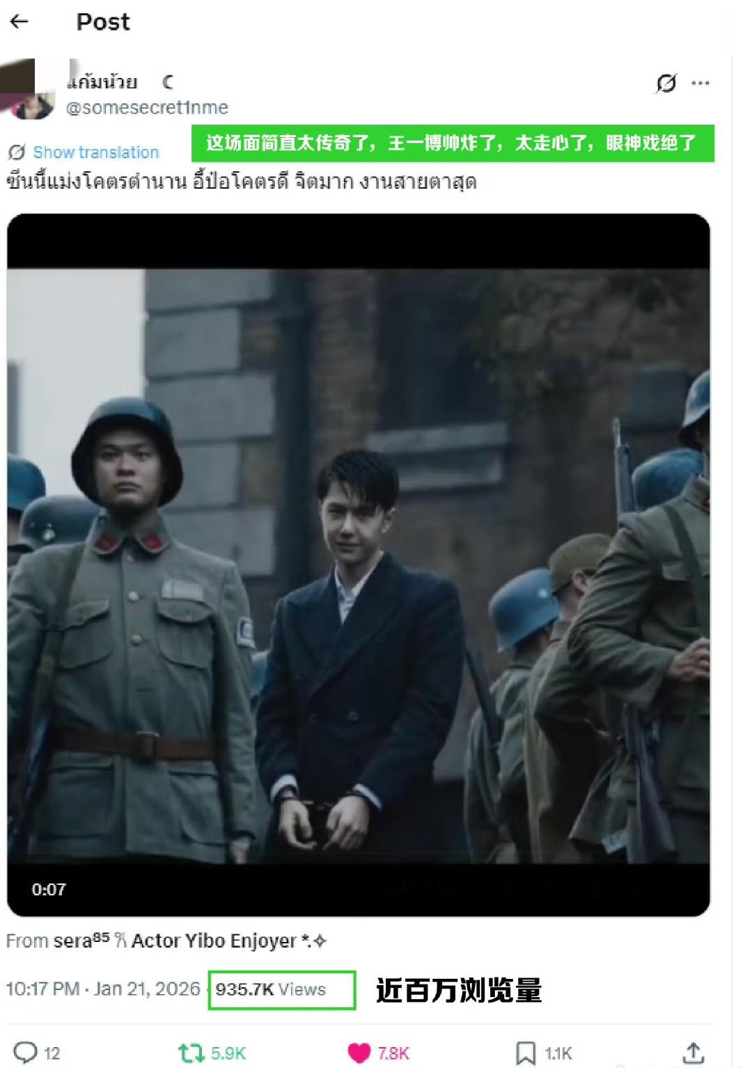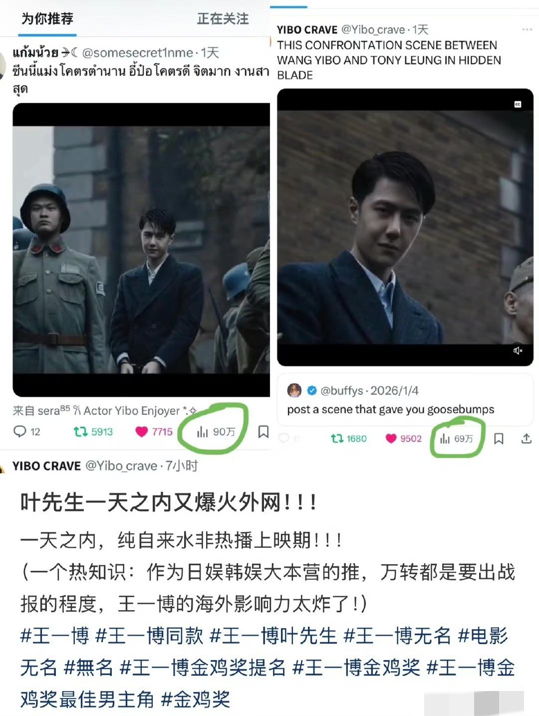冲破漫天黑氵的《无名》熠熠生辉,王一博精彩演绎的叶先生让人过目难忘。 近日,叶先生那一幕“卡车笑”的封神名场面在X上火了!是原帖发了一个“让你起鸡皮疙瘩的场景”的帖子,于是海外摩托发了叶先生卡车上的片段,仅仅一天时间最新浏览量已破百万! 而且,这是来自非上映期、非热播期! 《无名》终有名,叶先生的魅力无人能挡,纯粹的作者型导演的文艺片票房天花板,熠熠生辉的《无名》注定要在中国影史留名。 王一博