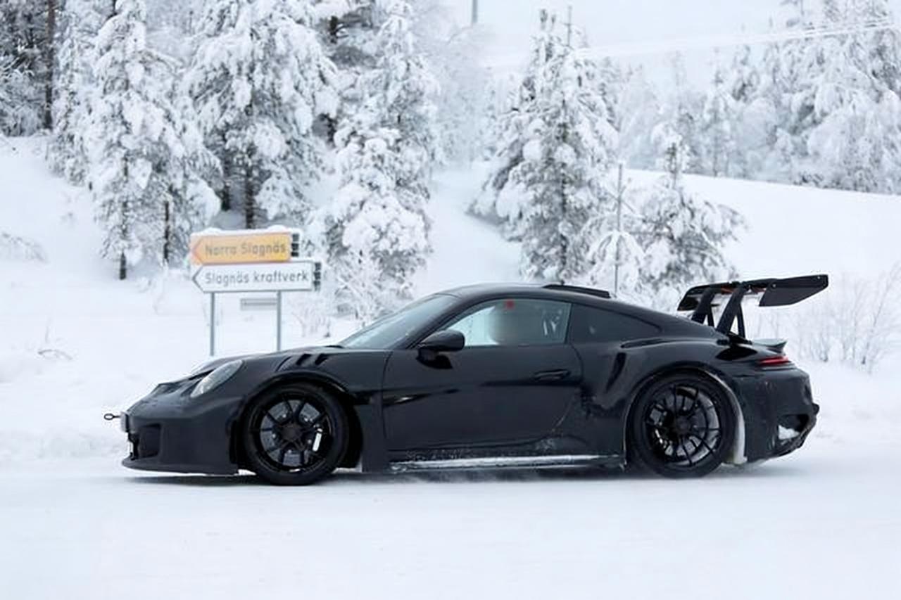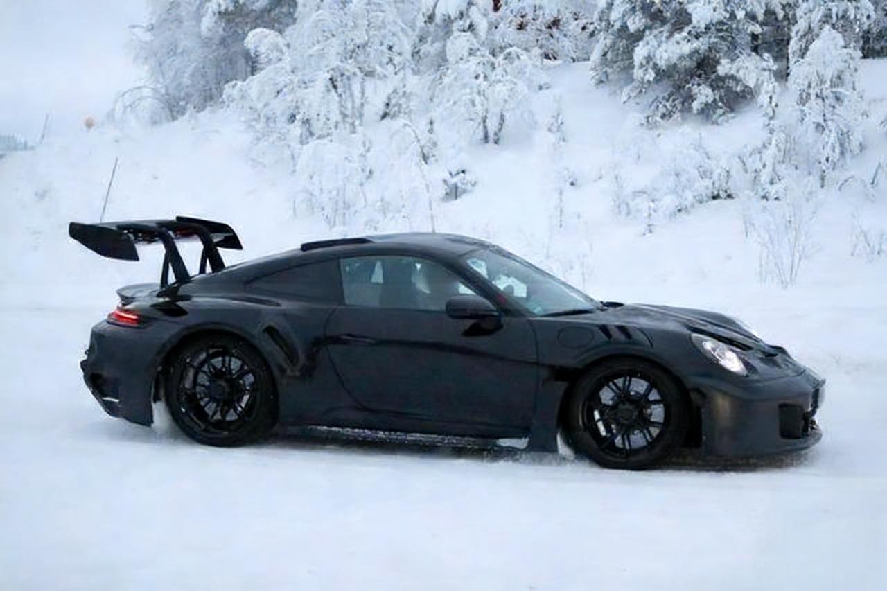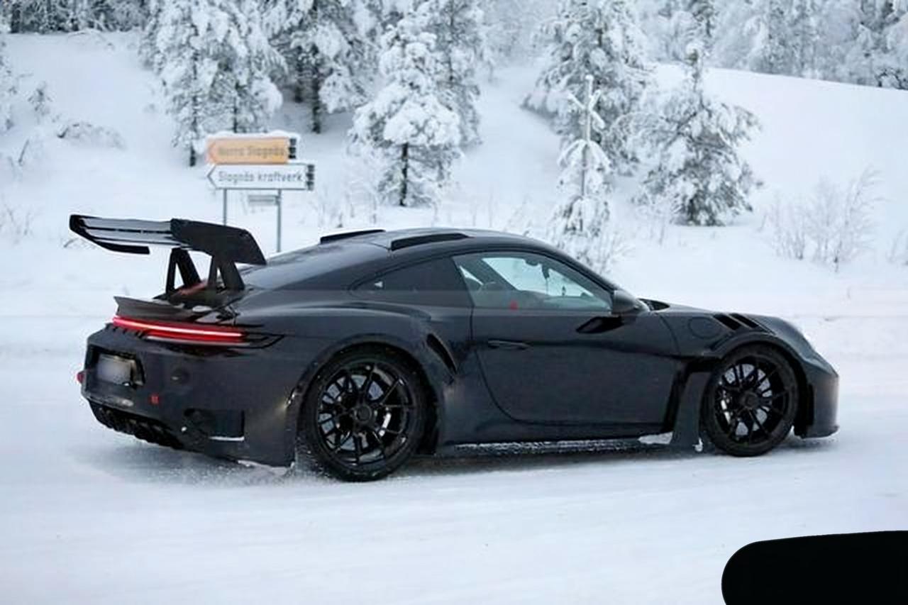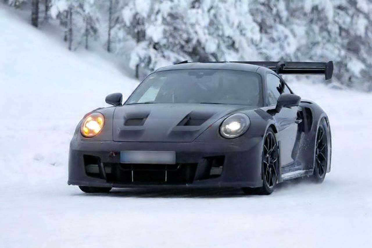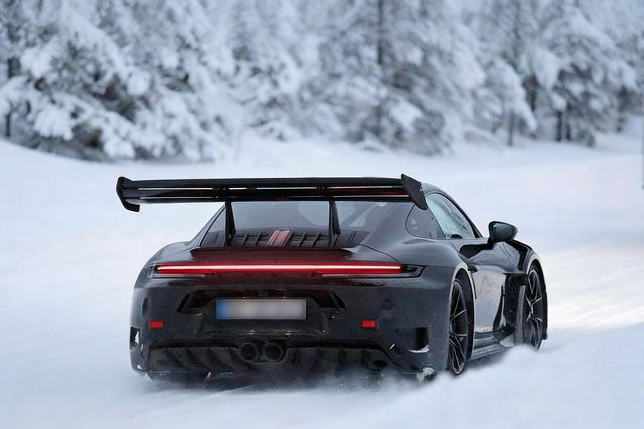 2027款保时捷911GT3RS雪地谍照曝光 外观上,前脸保险杠更激进,