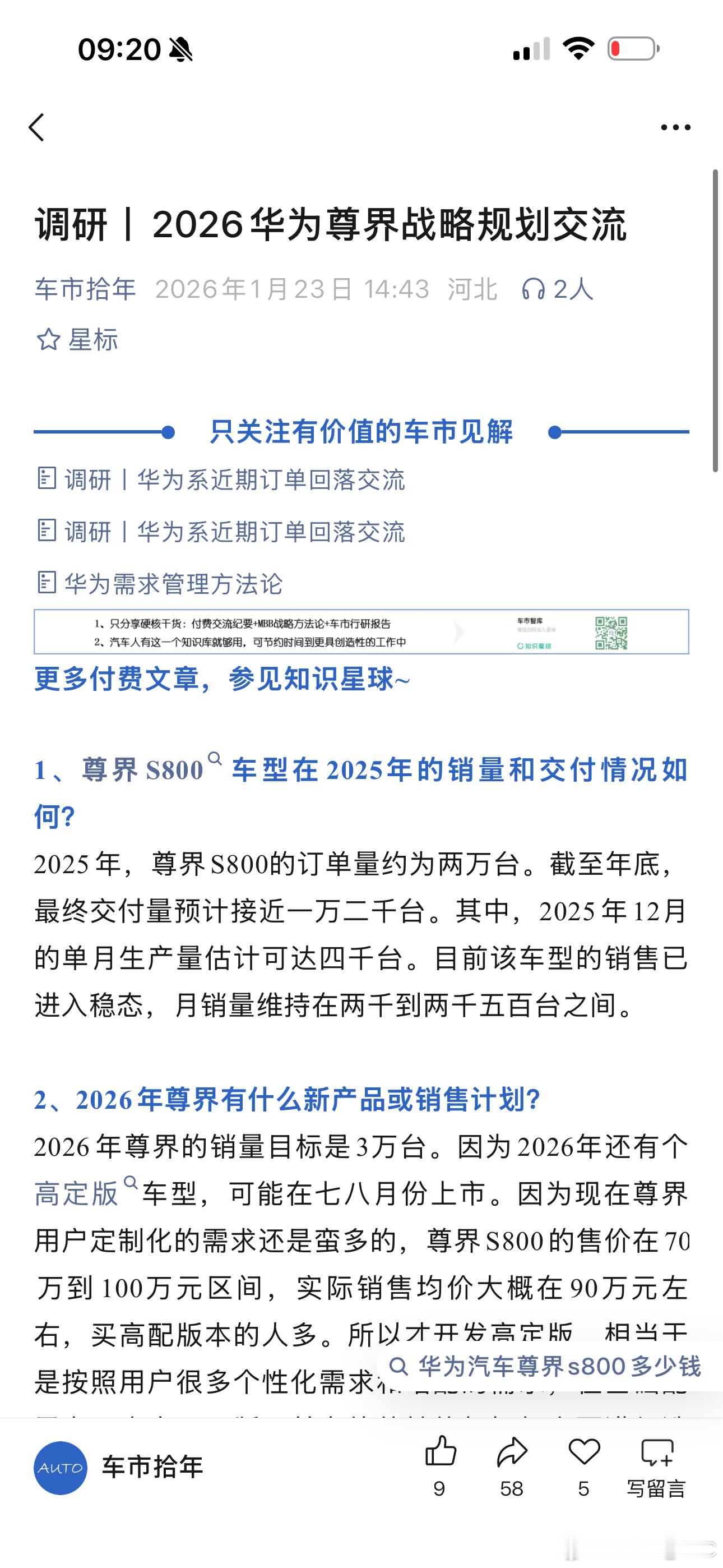 尊界26年规划:✅S800:25年订单约2万台,交付近1.2万台。现月销稳定在2000-2500台,售价70-100万、但实际均价约90万,高配更受青睐。26年S800销量目标3万台,七八月份将上市售价约130万的高定版,在基础配置上升级并迭代软件与智驾;✅MPV:与华为合作的MPV因造型修改推迟2个月,预计26年3-4月亮相,售价约40-80万。年销量目标20万台,内部稳健预期稳态月销1万台;✅SUV:预计2026年底至2027年初上市,定价60-70万且有涨价空间。整体来看,尊界继续维持超高端定位,暂无竞品。到27年可能会有一个变数,因为享界可能有一些想法去做高端路线。产能方面:目前工厂支持年产20万台,产能的瓶颈预计不在2026年,而在2027年。公司已启动产线二期改建计划,主要为后续的SUV车型预留产能。尊界s800尊界汽车