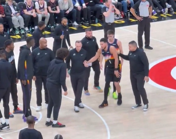 布克右脚踝扭伤,已经被队友搀扶回了更衣室! 太阳vs老鹰