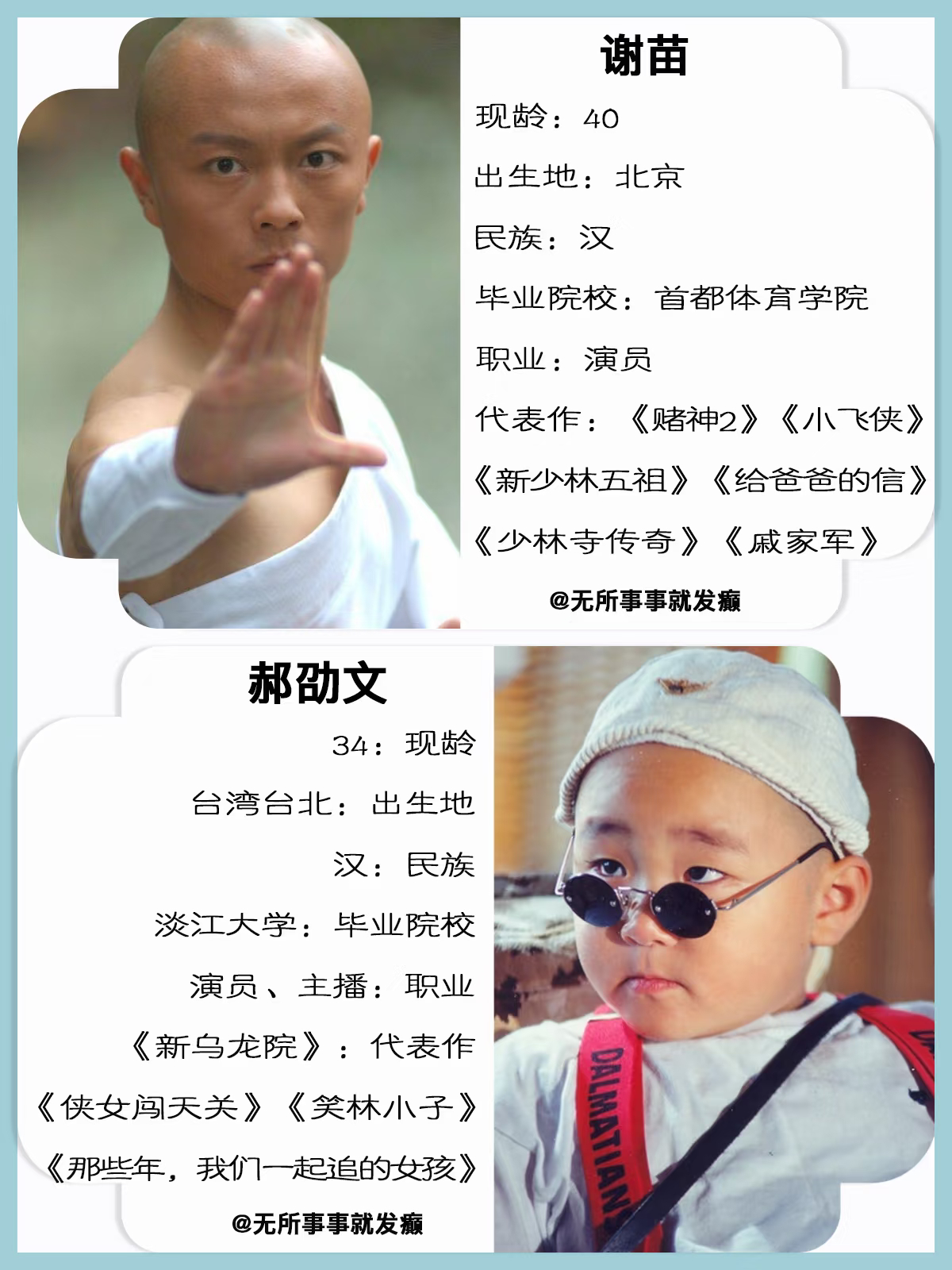 这4位小童星,是多少人童年的甜蜜回忆呀~小时候一度想嫁给释小龙 释小龙,想当年那个叼着奶瓶演戏的小奶龙,萌化了多少阿姨姐姐的心 曹骏,提到他,脑海中立刻浮现小和尚的纯真和沉香的深情,至今难忘啊! 谢苗,小时候就是个小功夫高手,打斗场面超燃的,让人印象深刻!郝邵文,那个圆滚滚的小胖子,一笑起来眼睛弯成月牙,至今忘不了!