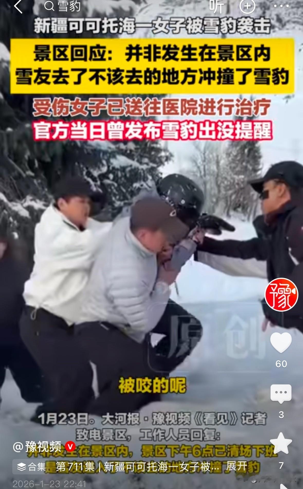 新疆旅游这女子,这下毁容了吧! 那么厚的雪,他们肯定已经沉浸在美景里了, 光顾拍照了, 没想到已经被雪豹盯上了。 所幸,只是咬伤了脸, 大冬天,雪豹肯定也要觅食, 这是城市生活久了,缺乏野外生存经验, 还要去挑战大自然呀!!!冬季旅游新疆 西藏雪豹 新疆景区事故