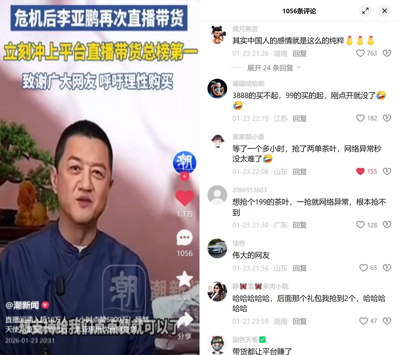 李亚鹏直播让大家理性买货,大家偏要跟他对着干,1小时点赞5000万,99块的茶叶