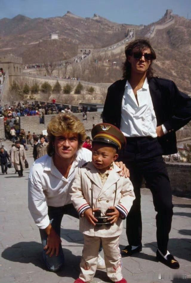 1985年英国威猛乐队(Wham!)访华期间,乔治·迈克尔(George Michael)和安德鲁·里奇利(Andrew Ridgeley)游玩长城期间和戴军帽的小孩合影。这张照片背后,其实有一部非常著名的纪录片在拍摄——由英国导演林赛·安德森(Lindsay Anderson)执导的《威猛在中国》。