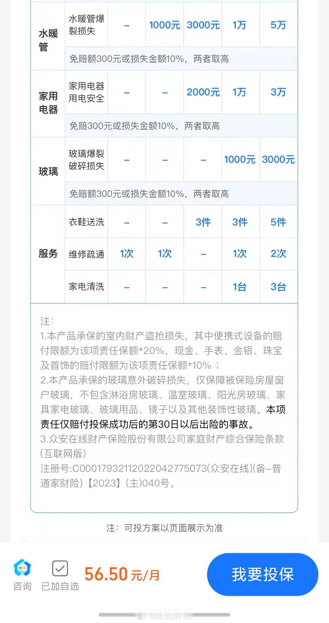 我买了一份财产险,保障房屋安全,保额800万,一个月才56块,买个安心。